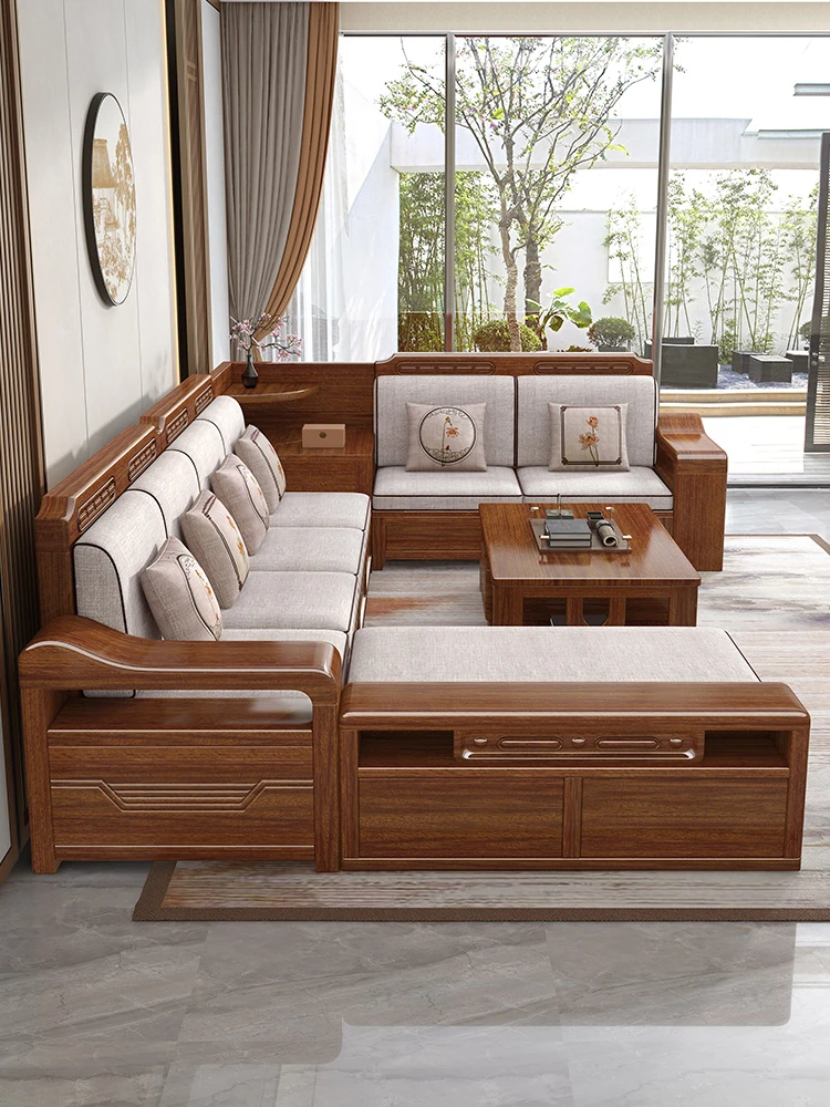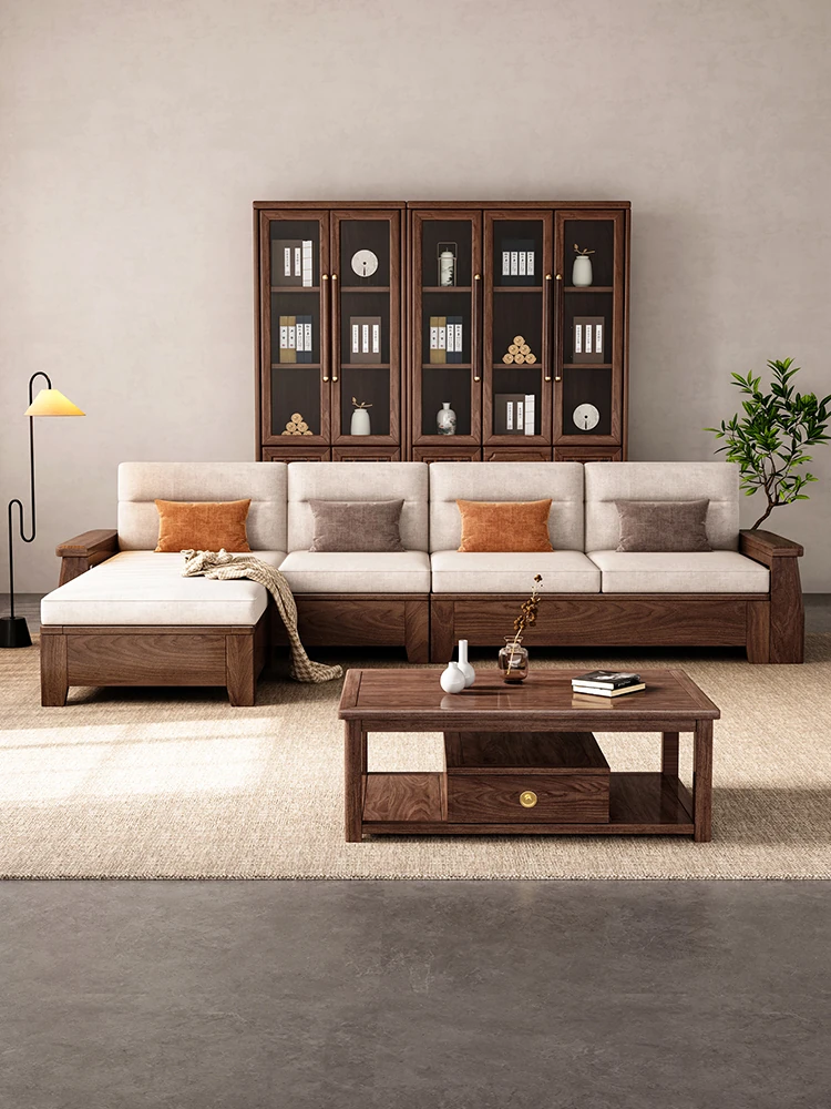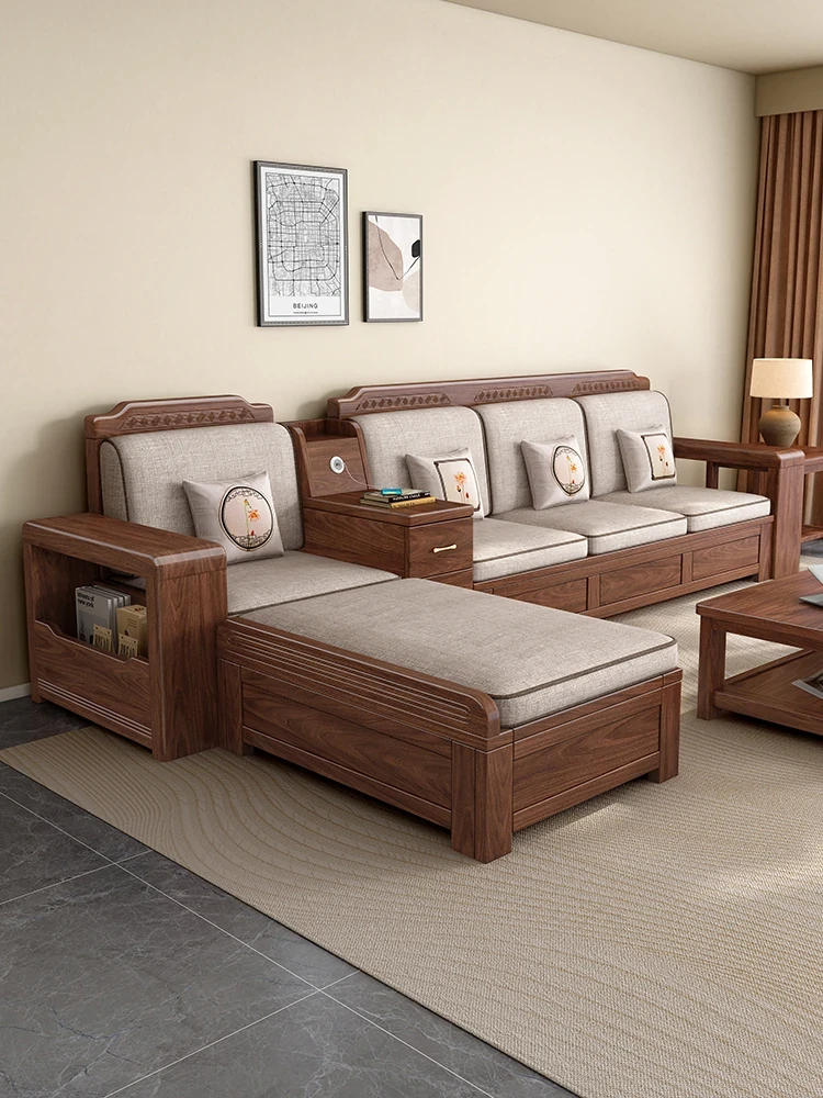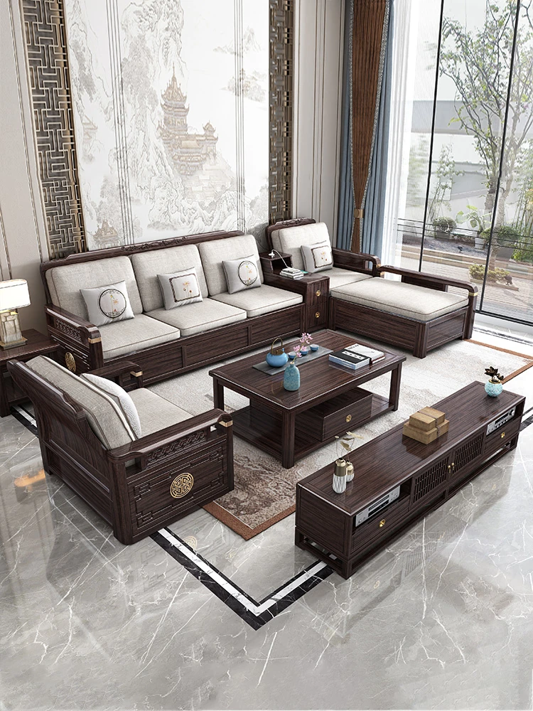 冬夏兼用のブラックウォールナット無垢材ソファセット - スタイリッシュな収納機能付き、ラグジュアリーな新中式デザインで、贅沢な別荘のリビングに最適な家具。