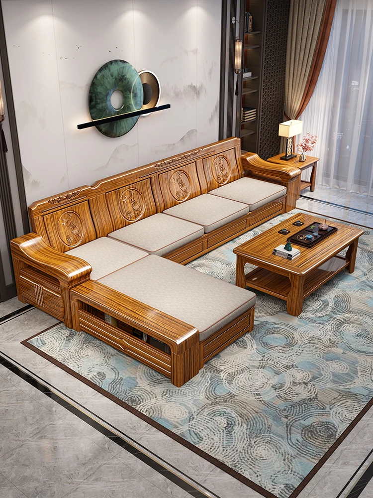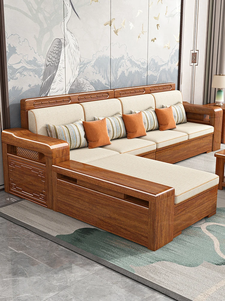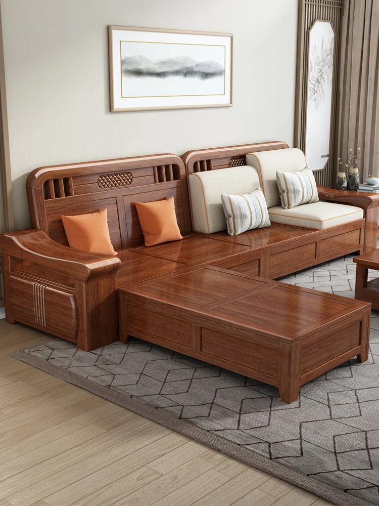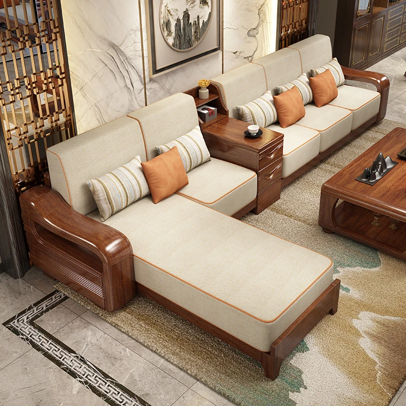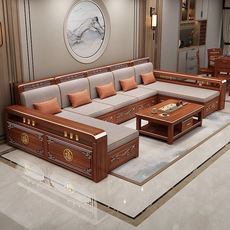 新中式デザインの金色のクルミの無垢材ソファセット - 冬でも夏でも快適、シンプルでモダンな収納付きの実用的な家具!