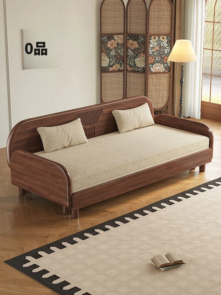 新中式デザインのブラックウォールナット無垢材ソファベッド - スペースを有効活用できる小型リビング向けの伸縮式多機能ソファとベッドの2wayタイプ!快適な座り心地と寝心地を両立したおしゃれなアイテムです。