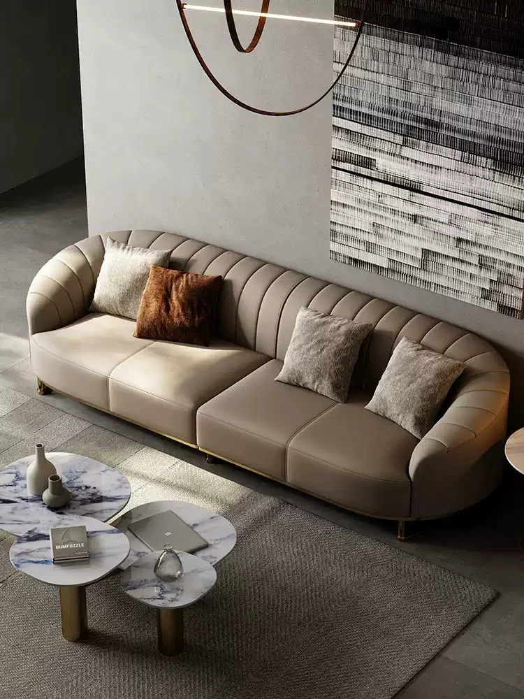 イタリアンラグジュアリー本革ソファー - シンプルで洗練されたデザインのアーチ型ソファー、大型リビングルームに最適!高級感あふれるミニマリストスタイルで、あなたの別荘を格上げします。