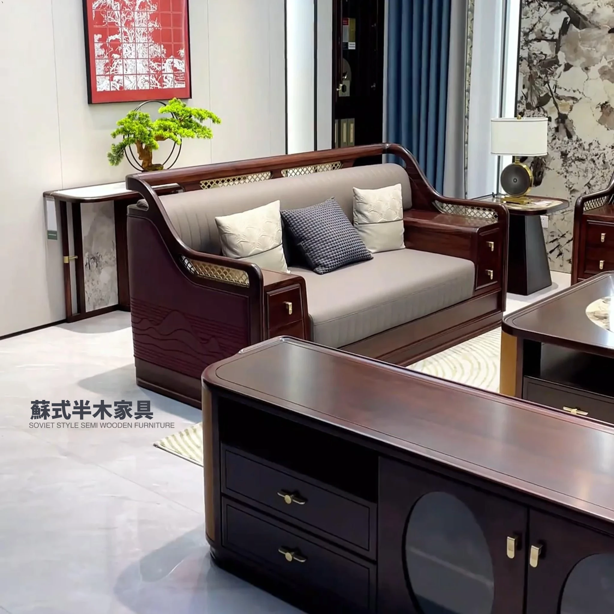 新作 中式胡桃木彫刻 ソファセット 家庭用リビングに最適 冬夏両用 小型収納家具 おしゃれで実用的!