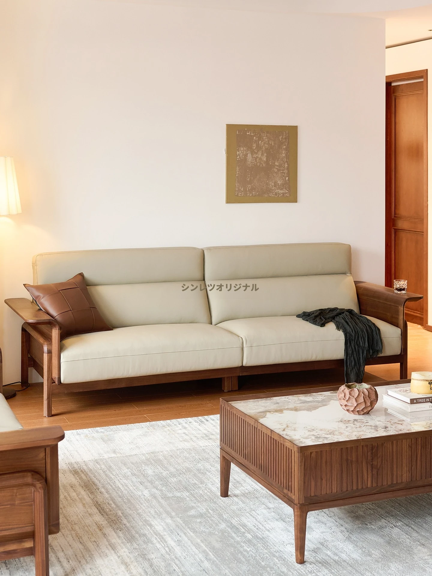 新中式ウッドウエア、真皮軽奢モダンソファー。別荘や大小の住宅にぴったり!肘掛け付き収納ボックスで、実用性と禅の美を兼ね備えた高級家具。あなたの空間を特別に演出します!
