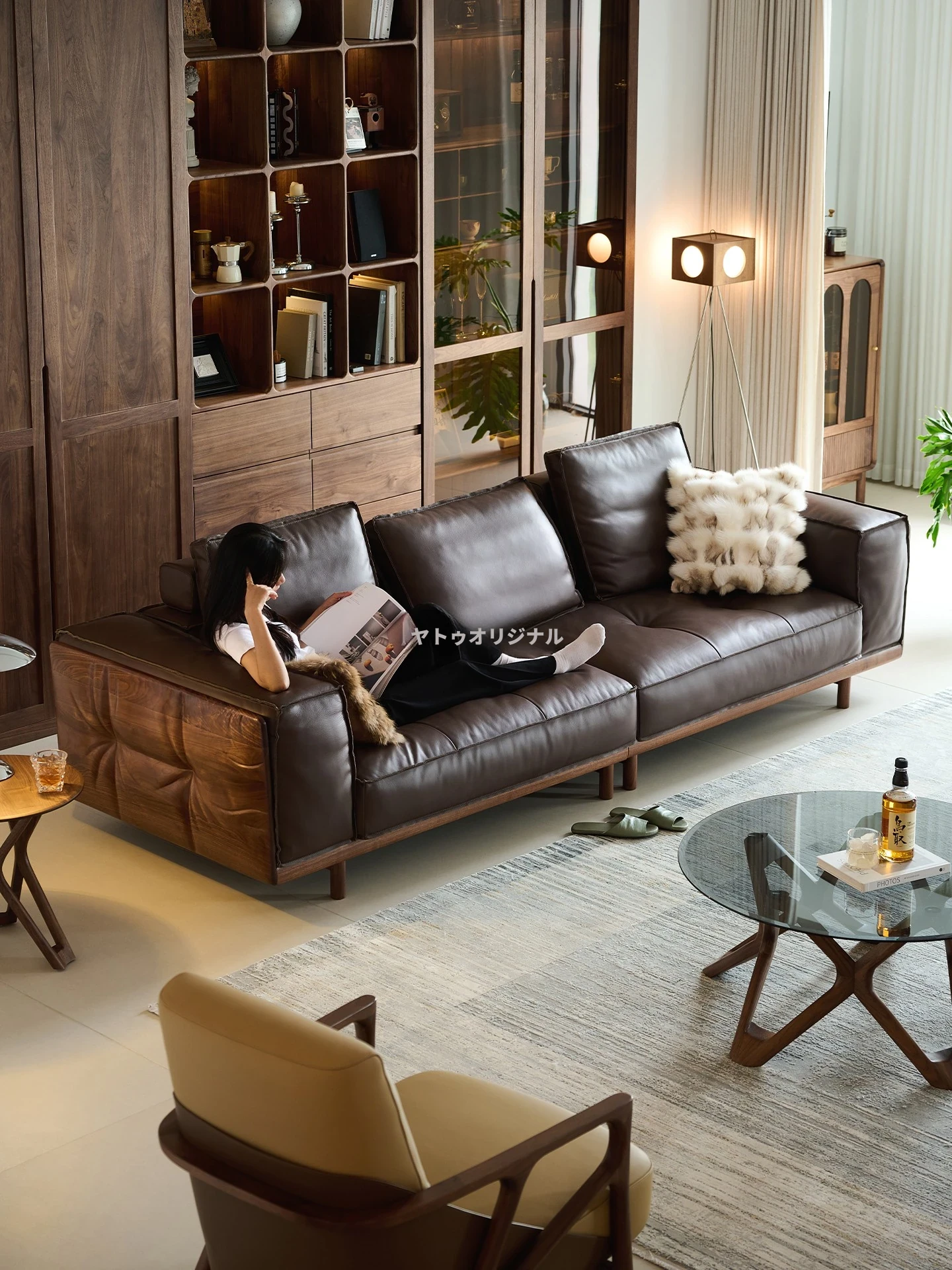 イタリアンミニマリズム 北米産ウォールナットのラグジュアリーソファ 高級感あふれるリビングに最適 本革使用の大きなソファ 上質な牛革の一層革で贅沢なひとときをお届けします。