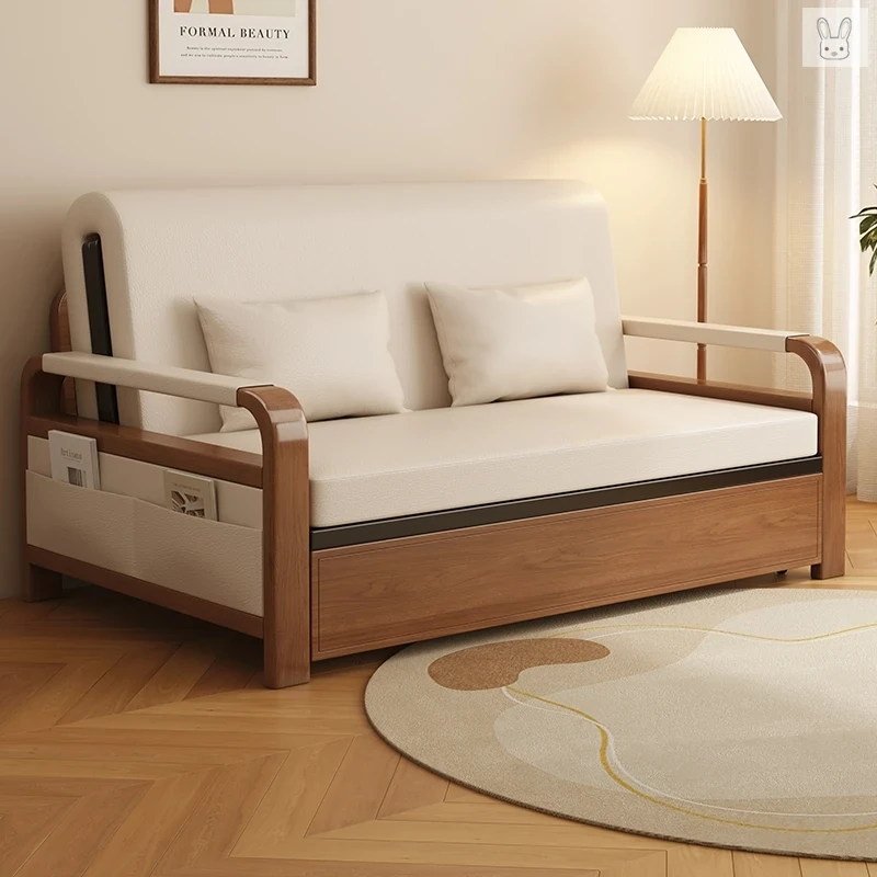 Versatile Solid Wood Sofa Bed - Foldable, Multi-functional Pull-Out Design for Living Room, Accommodates Single or Double Use, Perfect for Seating and Sleeping Needs!
