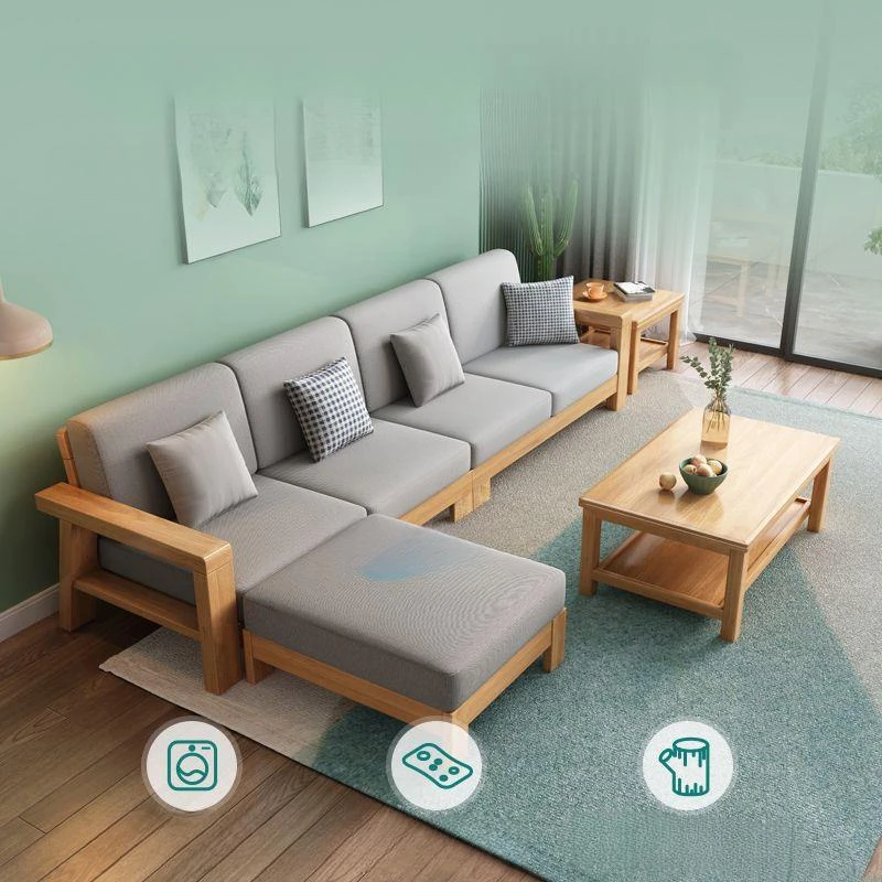 Nordic Solid Wood Sofa - Minimalist Modern Living Room Set with Chaise Lounge, Dual-Use Fabric for Winter and Summer, Perfect for Small Spaces, Natural Wood Finish Furniture