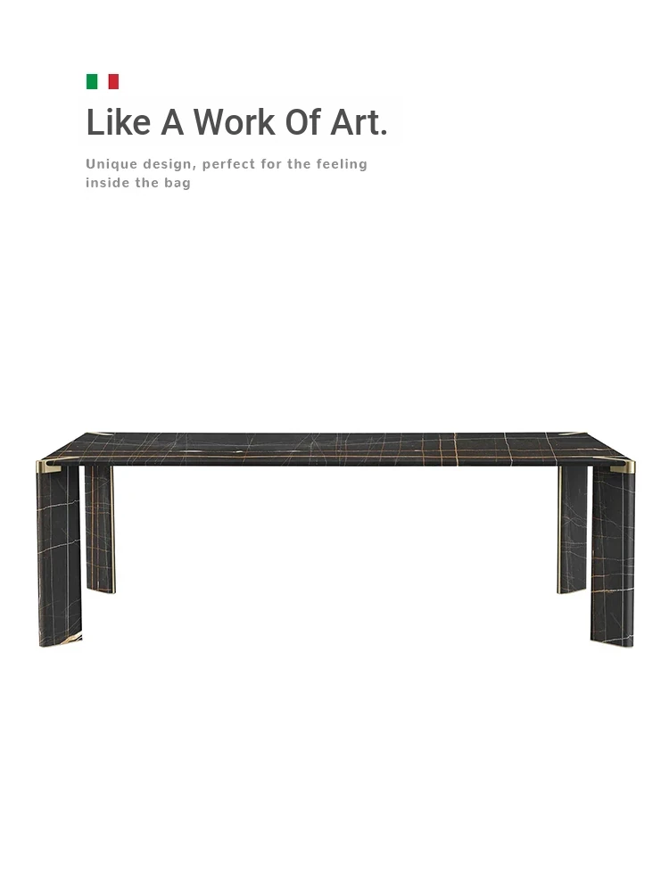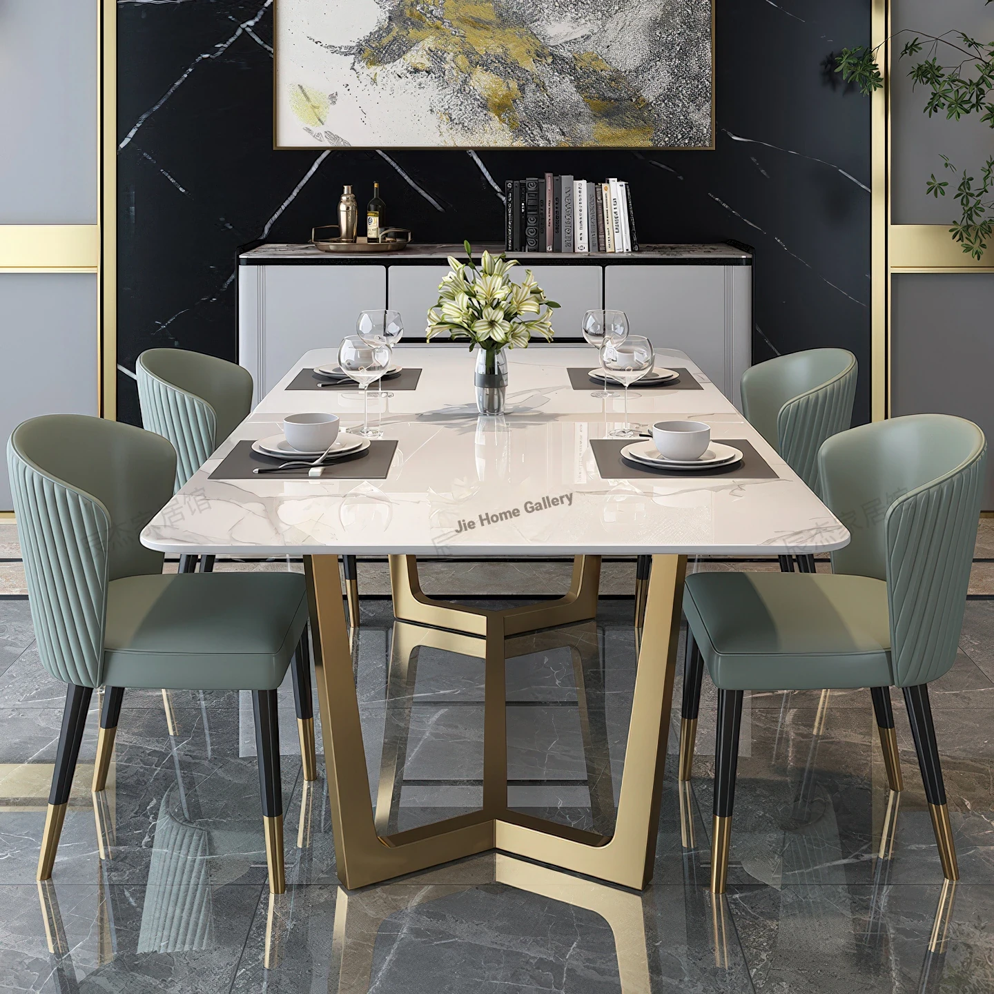 Modern High-End Rectangular Dining Table with Glossy Rock Surface and Stainless Steel Frame - Luxurious Italian Marble Table and Chair Set for Stylish Dining Experience