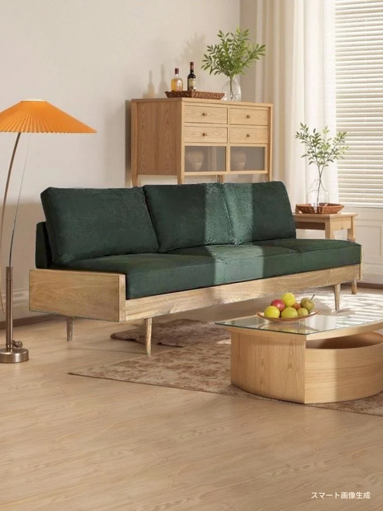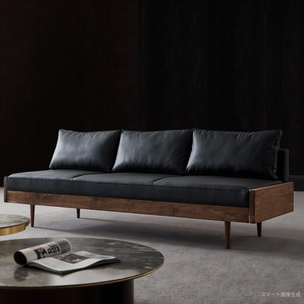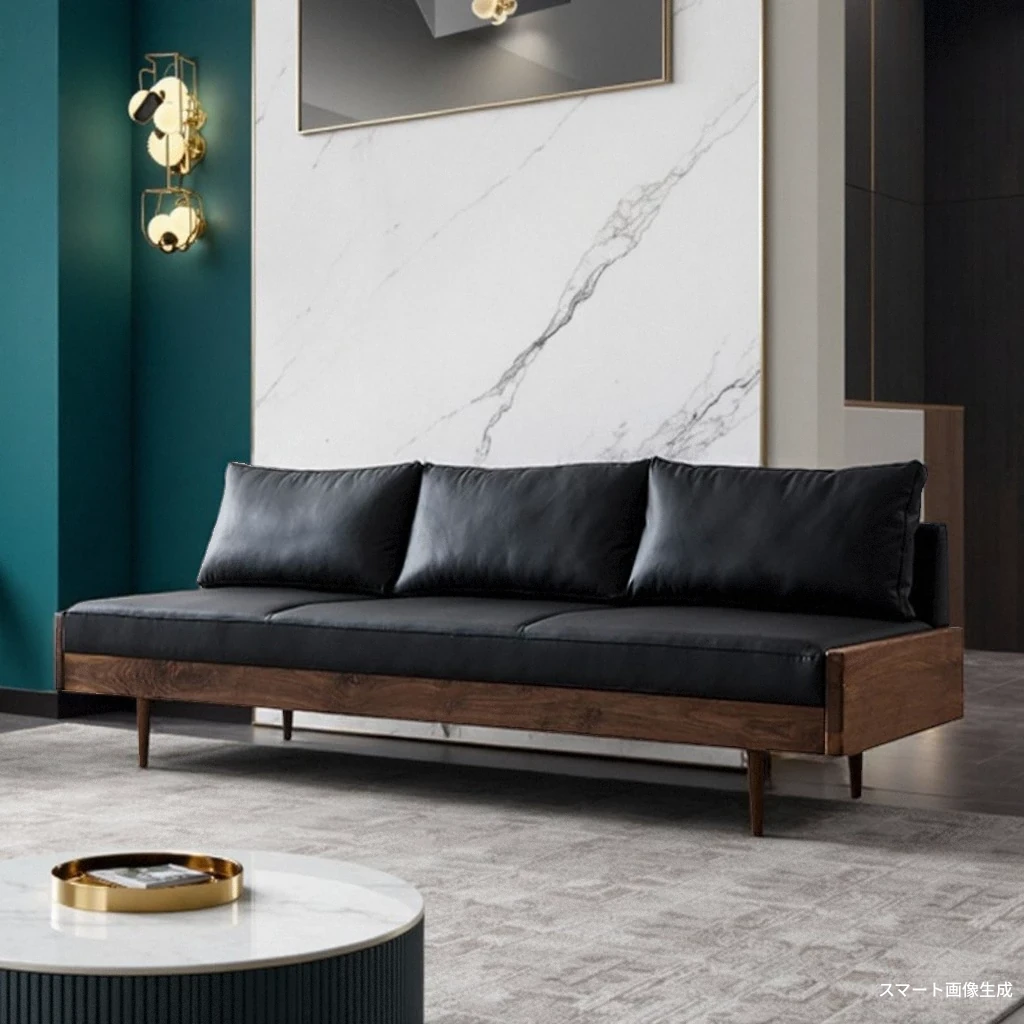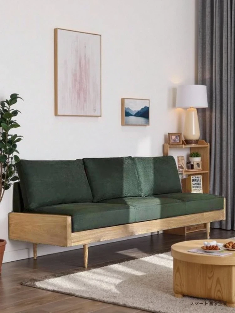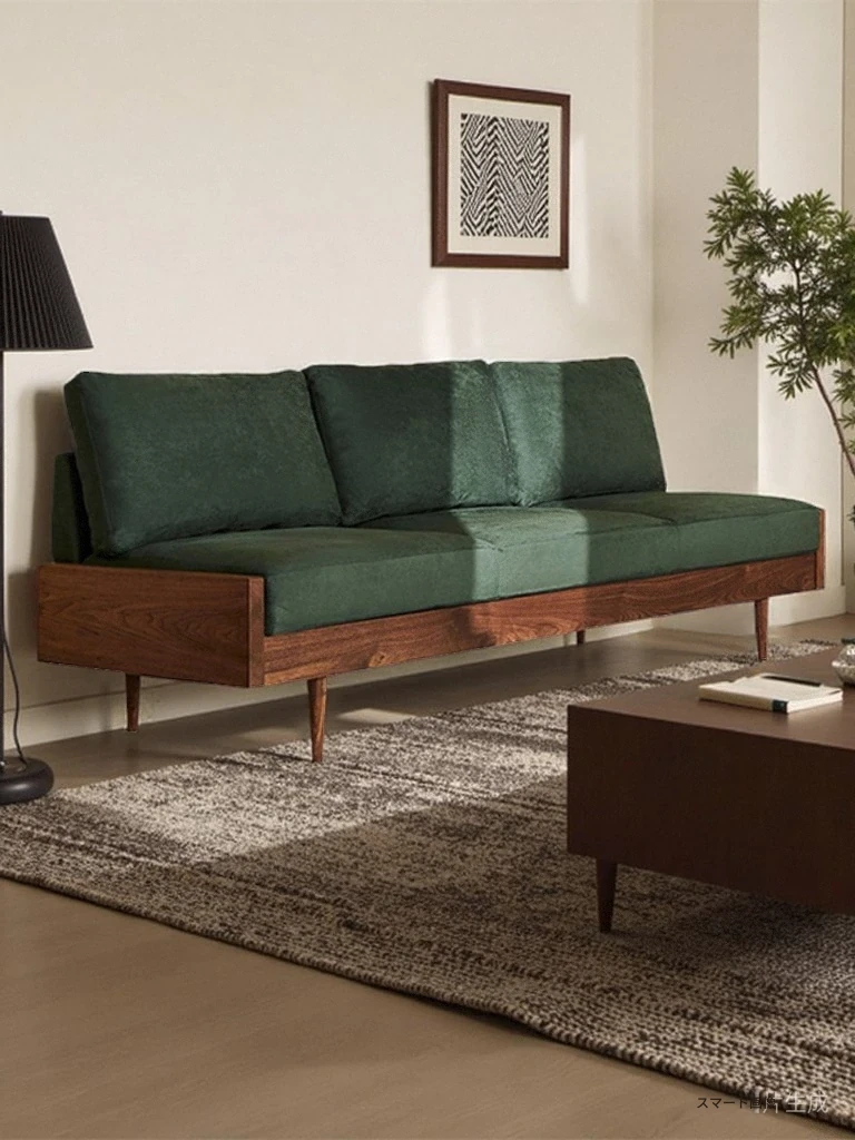 2025年新作!北欧スタイルの小型リビングソファ - アームレスデザイン、ブラックレザーとグリーンファブリックのコンビネーション、天然木フレームで優雅さと快適さを兼ね備えた一品!おしゃれな空間を演出しましょう!
