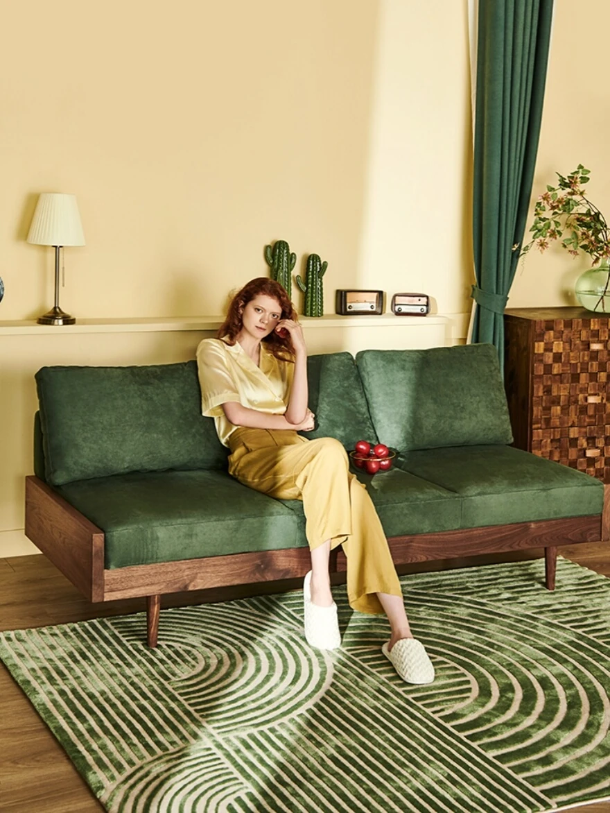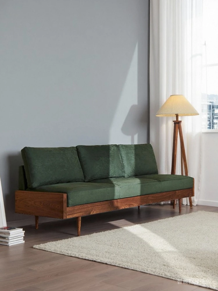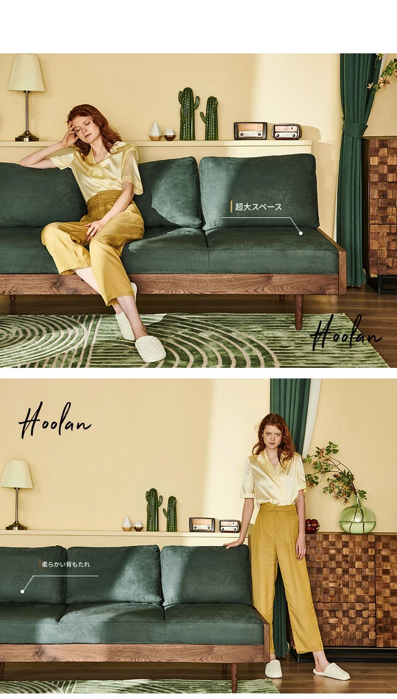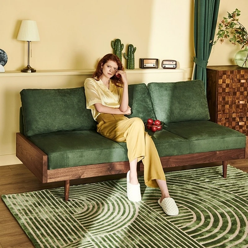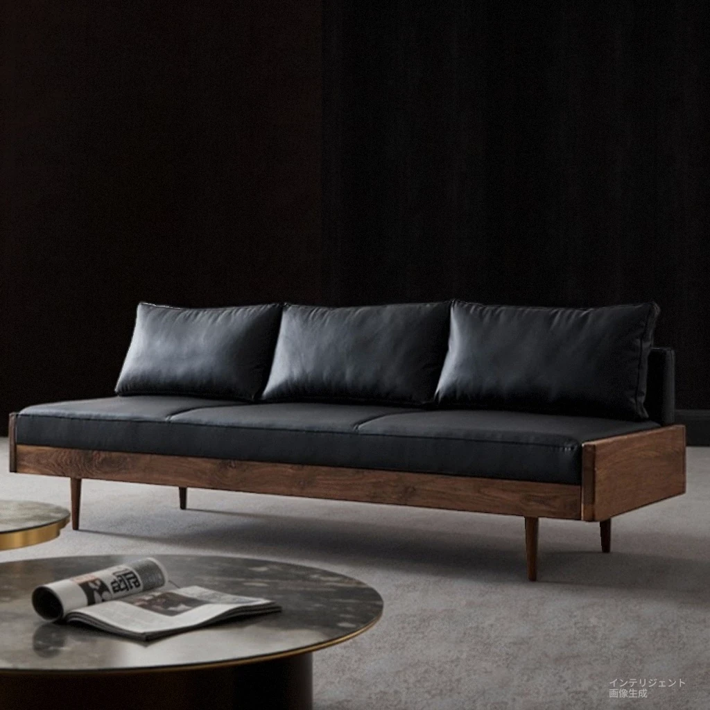 2025年新作!北欧スタイルの小型リビングソファ - アームレスデザイン、ブラックレザーとグリーンファブリックのコンビネーション、天然木フレームで優雅さと快適さを兼ね備えた一品!おしゃれな空間を演出しましょう!