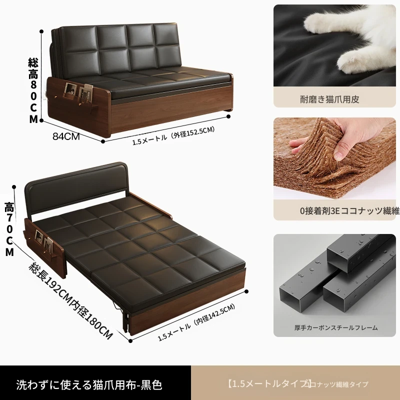 【レトロキャットクロー皮 | 背中サポートココナッツ】1.5mソファベッド-黒(組み立て別)