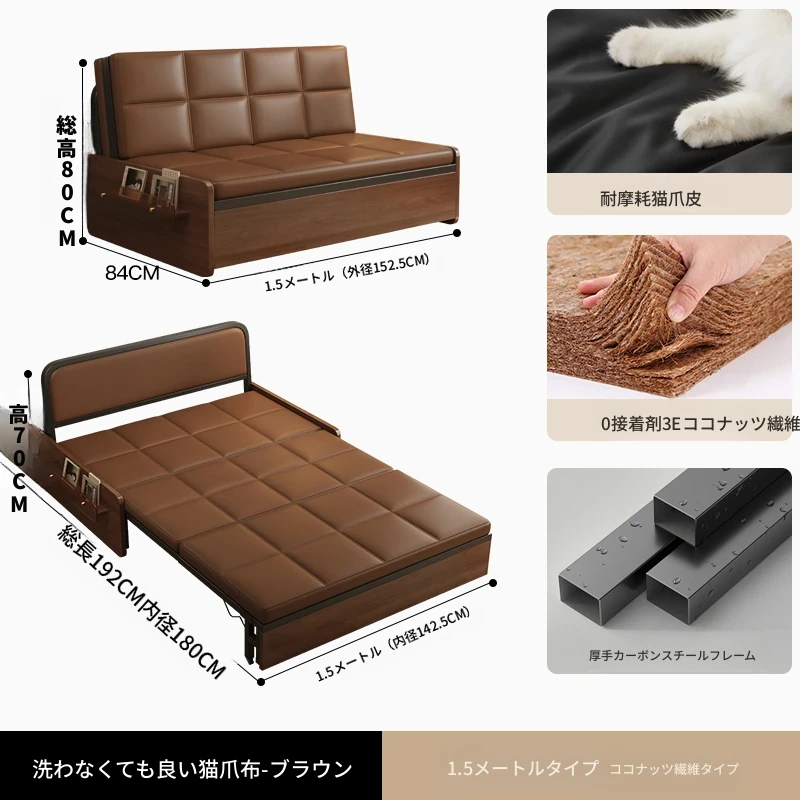【レトロキャットクロー皮 | 背中サポートココナッツ】1.5mソファベッド-茶色(組み立て別)
