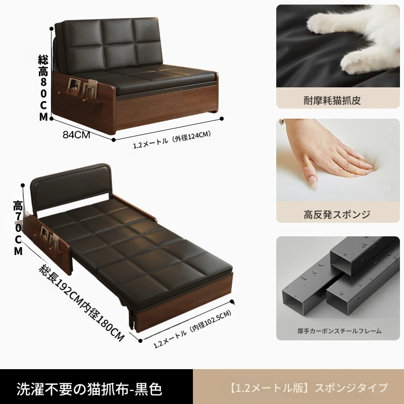 【レトロキャットクロー皮 | 厚手スポンジ】1.2mソファベッド-黒(組み立て別)