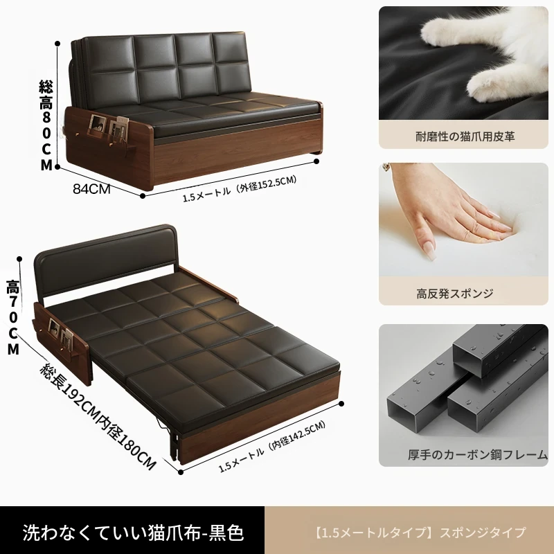 【レトロキャットクロー皮 | 厚手スポンジ】1.5mソファベッド-黒(組み立て別)