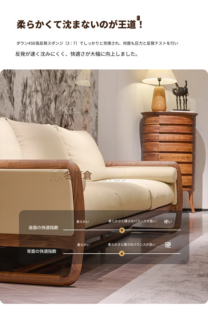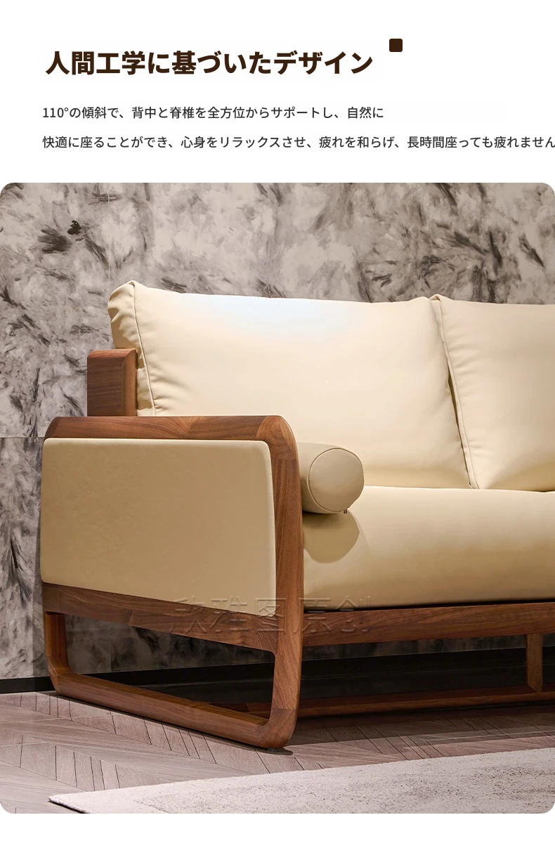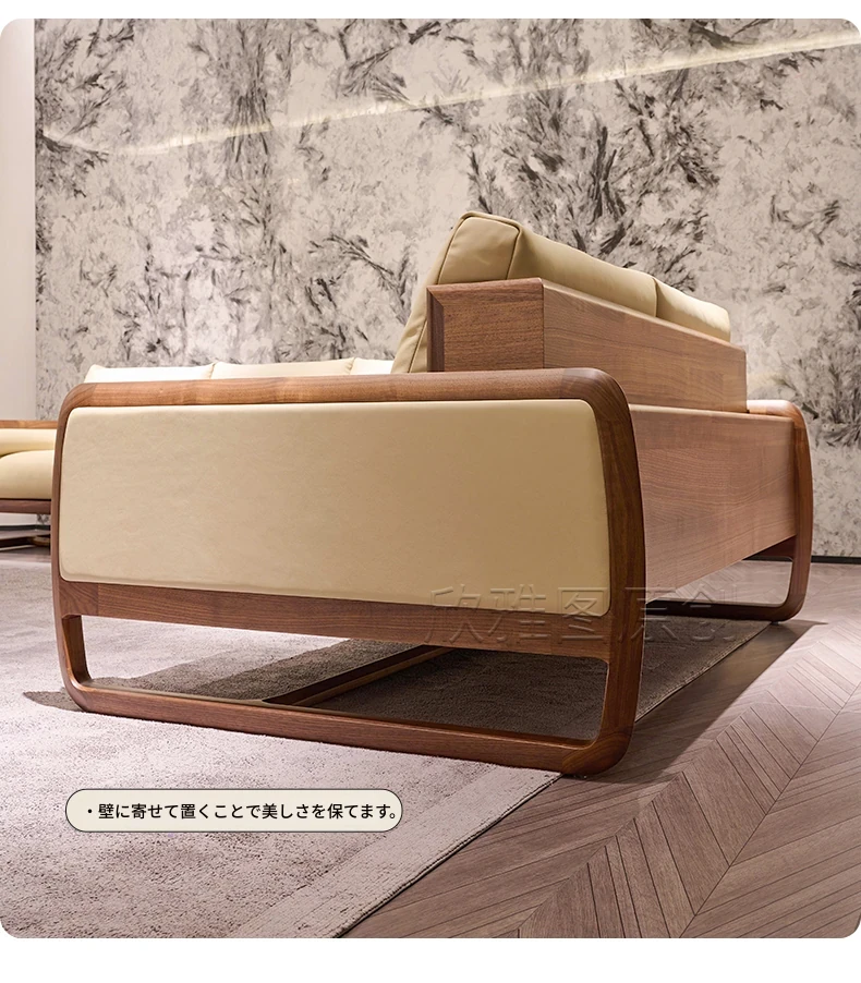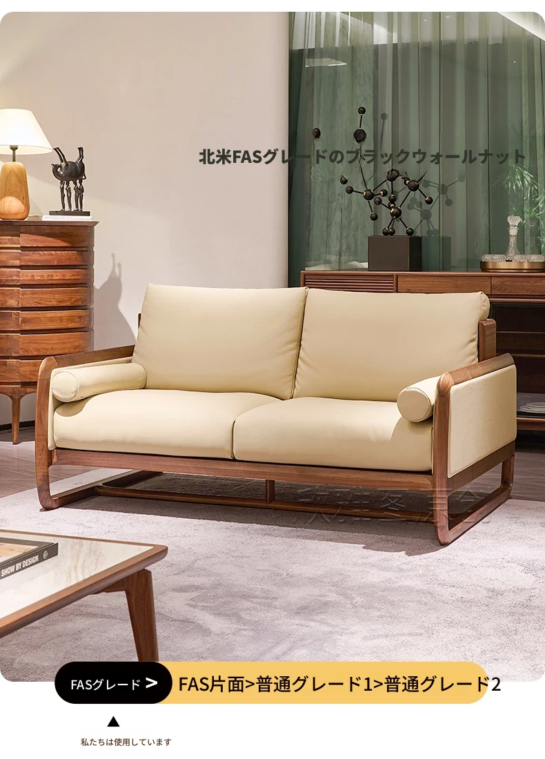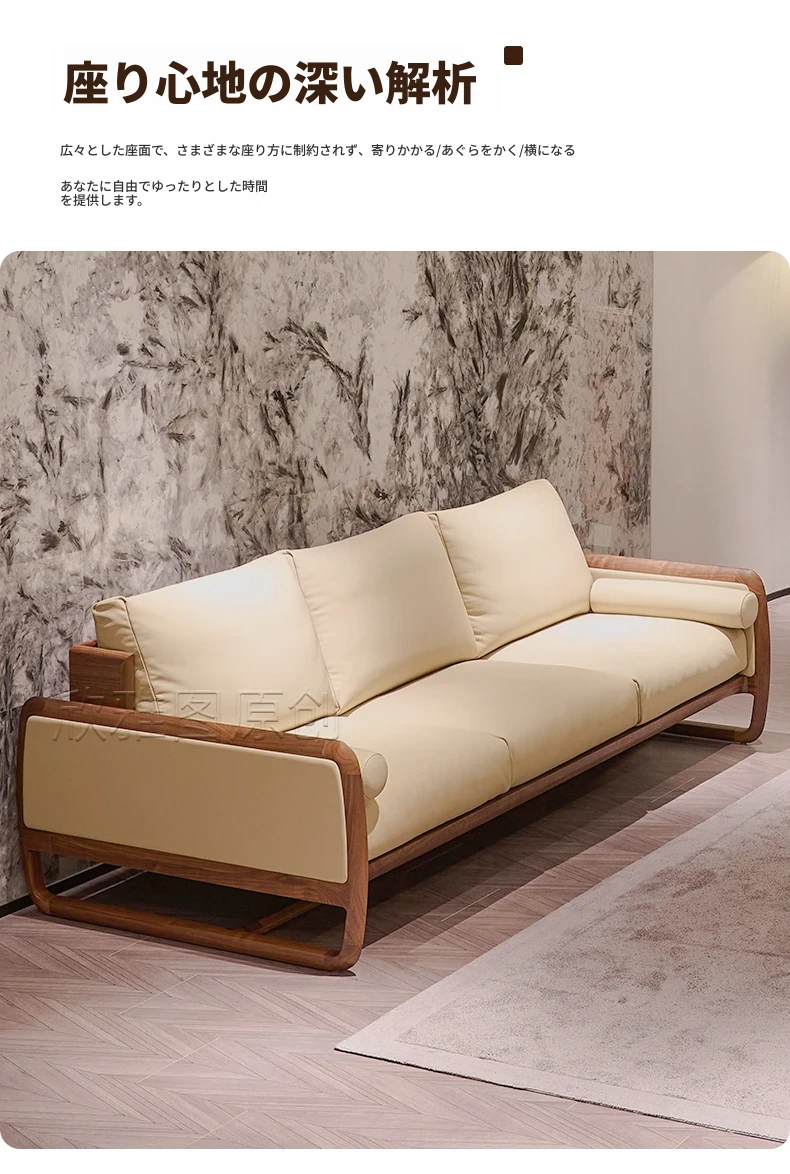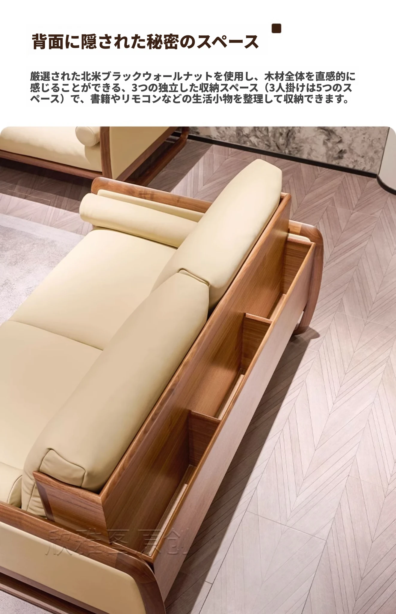 イタリアンミニマルデザインの無垢材と本革ソファ・高級フルグレイン牛革・新中式スタイル・大邸宅リビングに最適・北米産ブラックウォールナット使用の贅沢ソファ