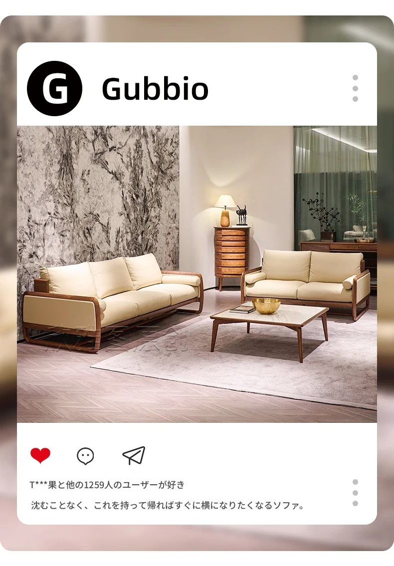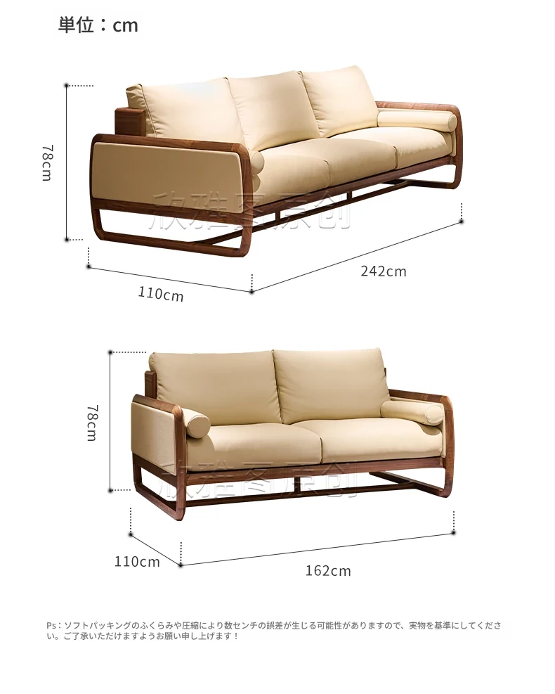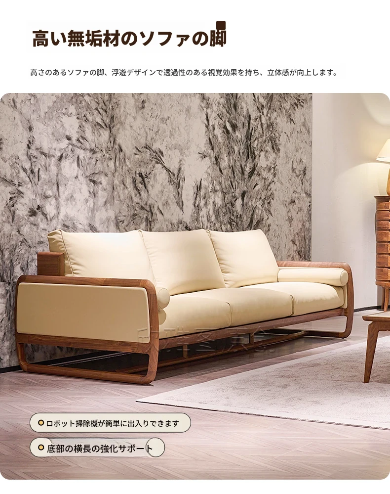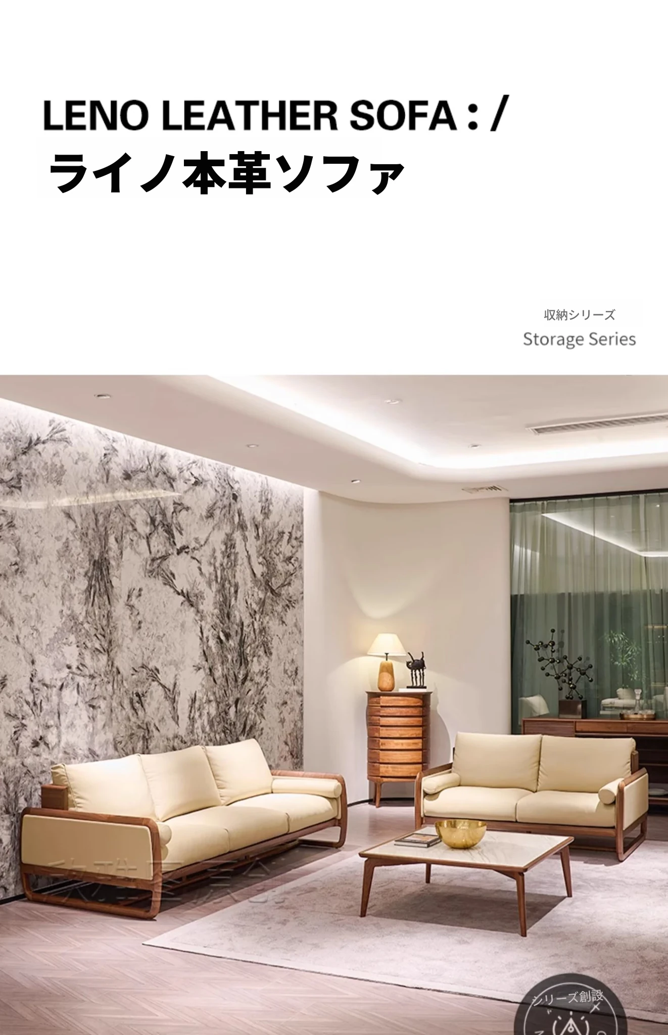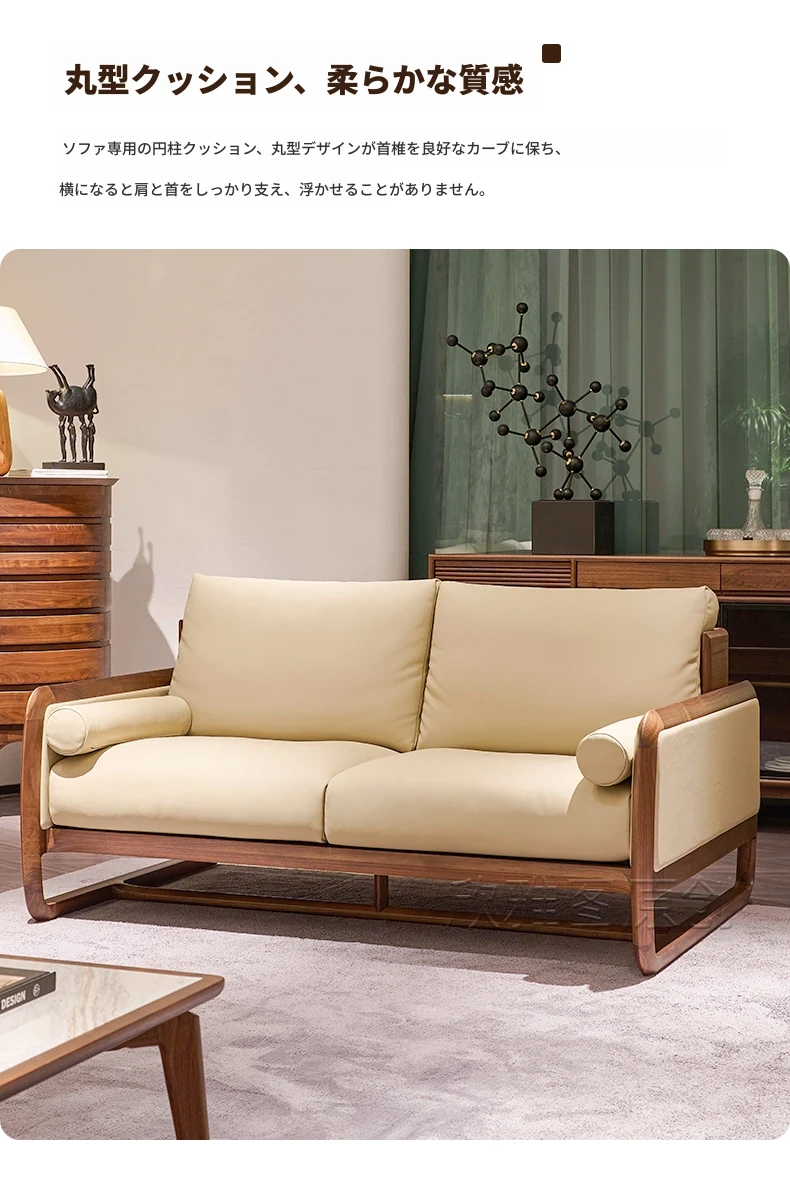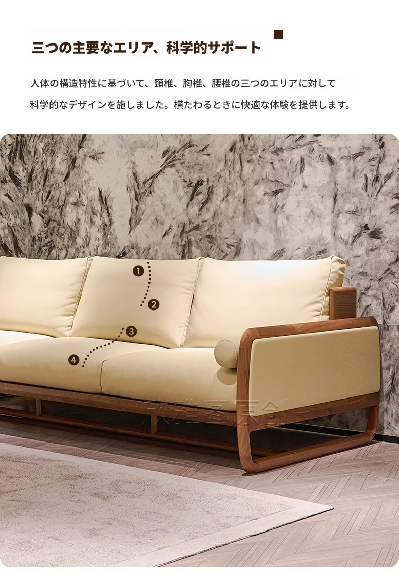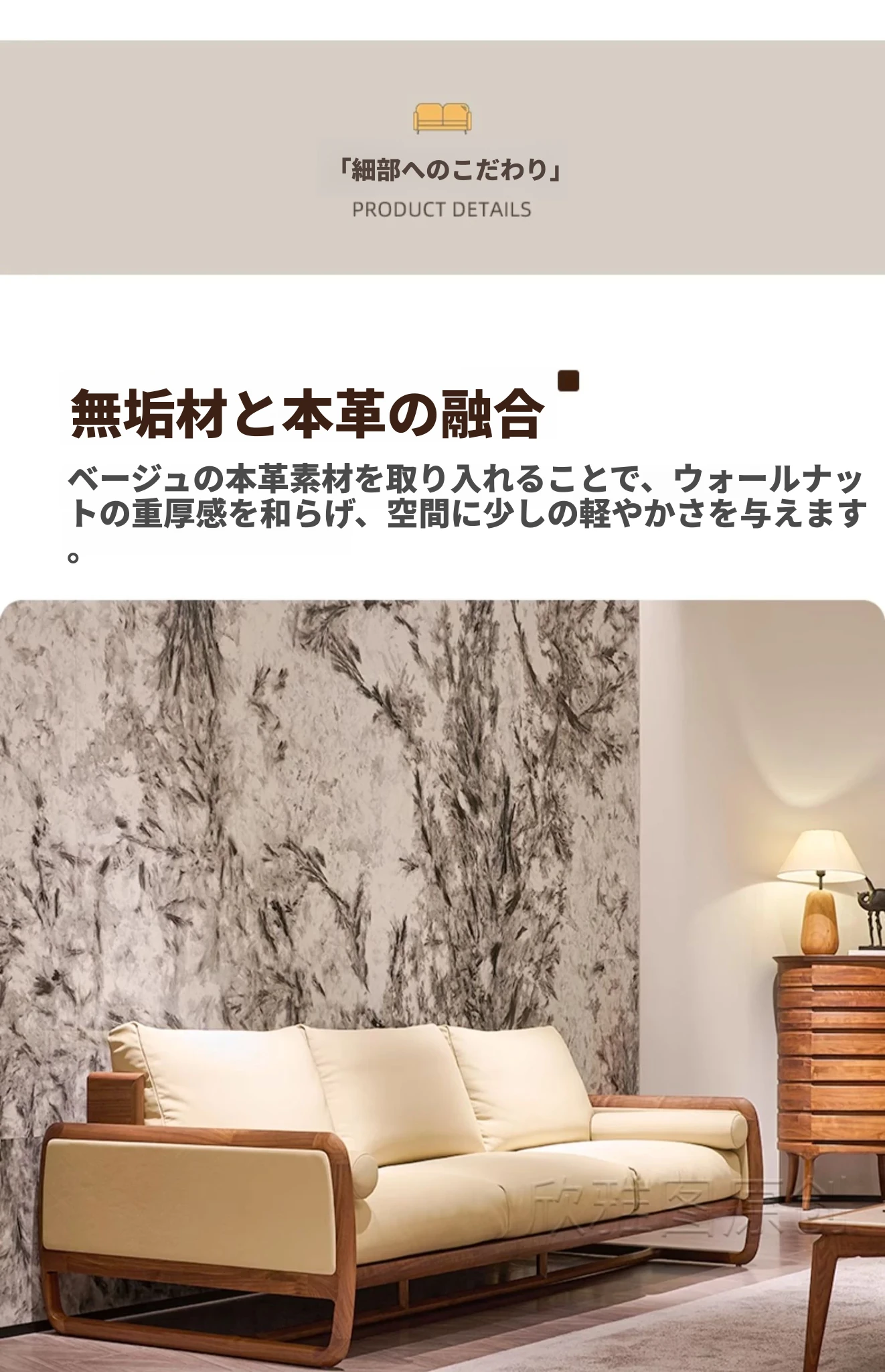 イタリアンミニマルデザインの無垢材と本革ソファ・高級フルグレイン牛革・新中式スタイル・大邸宅リビングに最適・北米産ブラックウォールナット使用の贅沢ソファ
