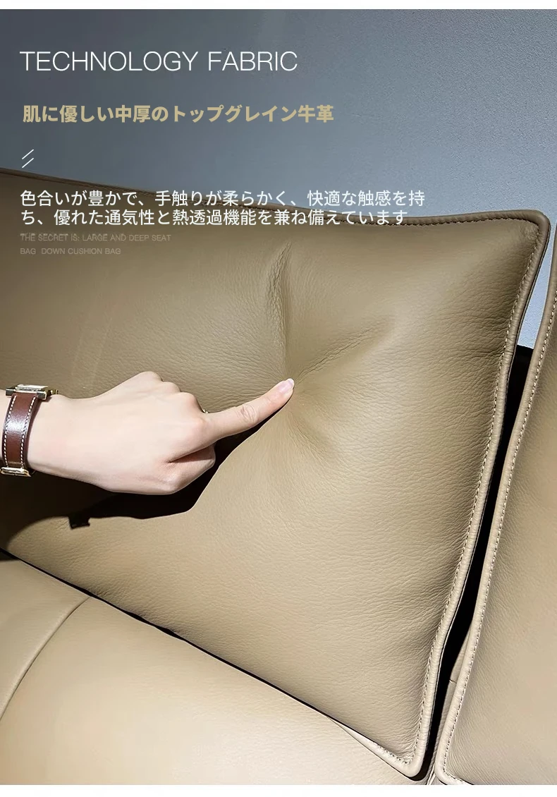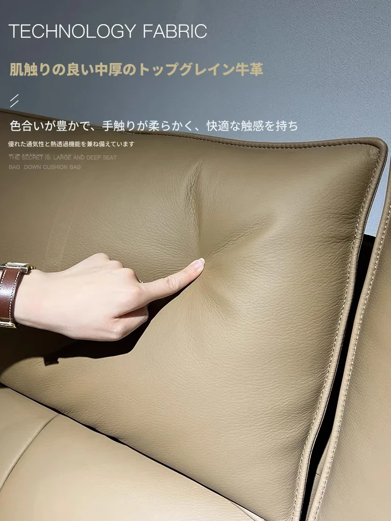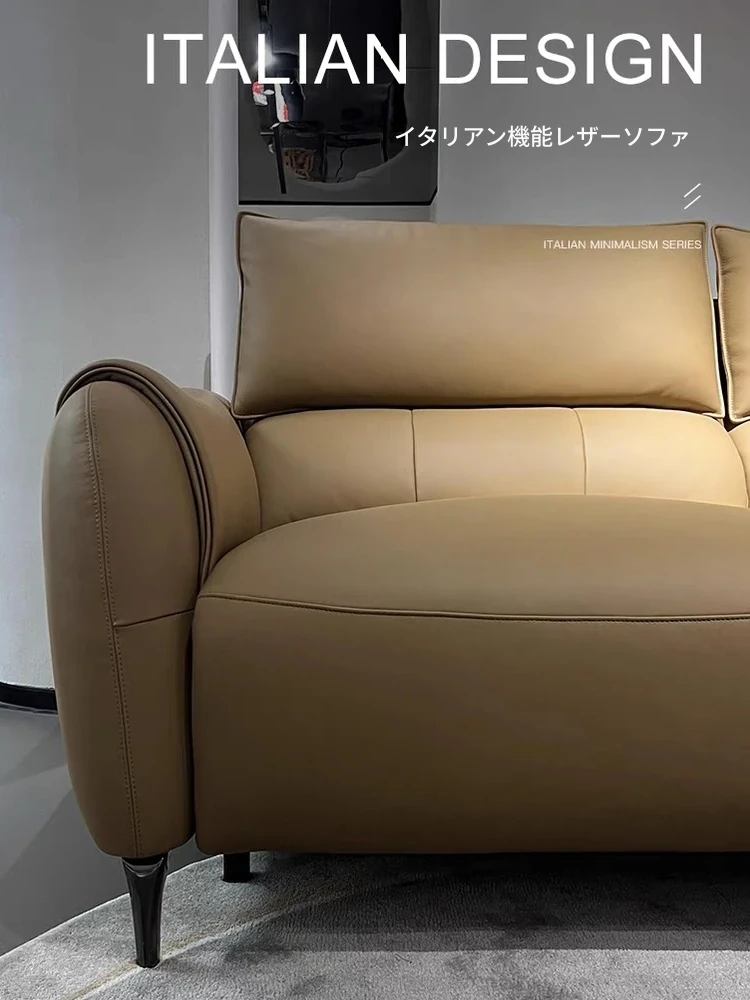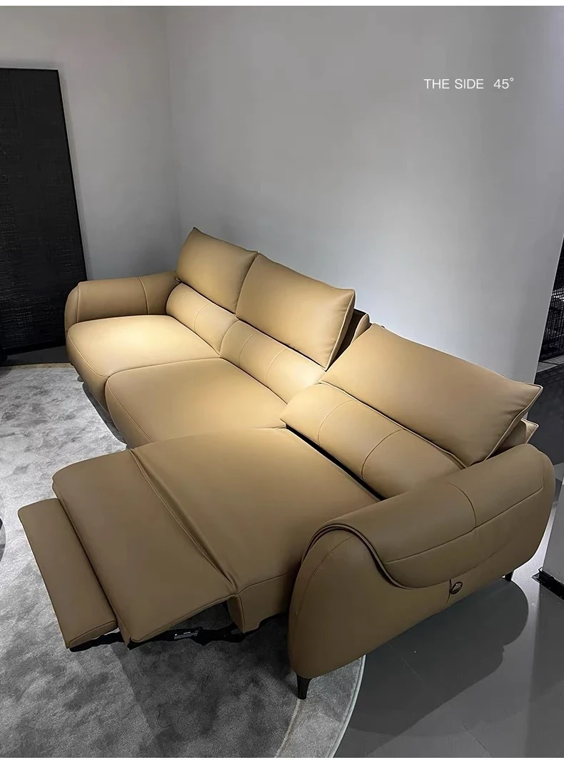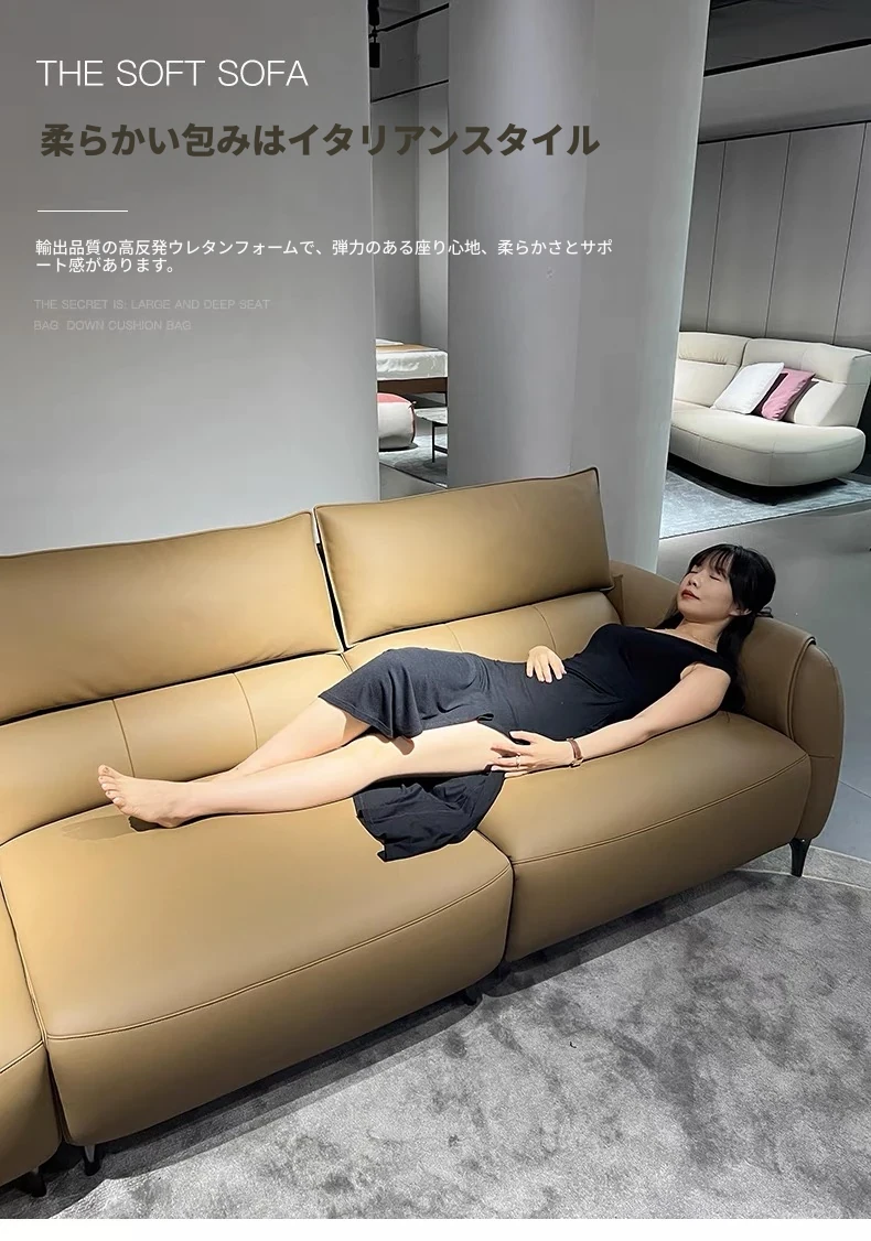 ファーストクラスの電動伸縮機能付き本革ソファー - 上質な牛革使用、イタリアンミニマリズムデザイン、3〜4人用、贅沢な羽毛クッションで極上の座り心地を実現!