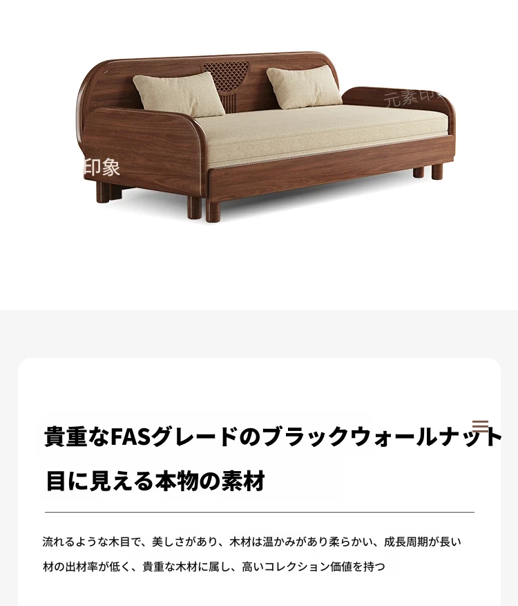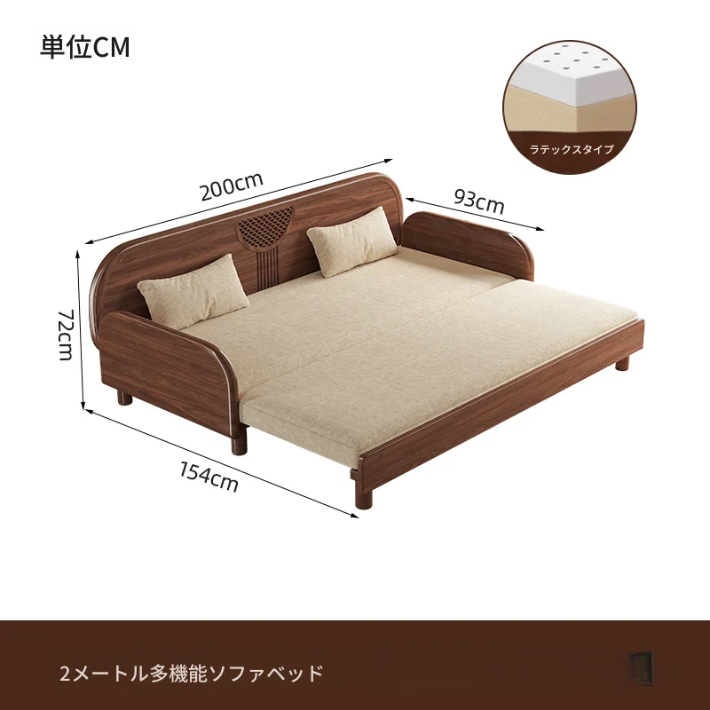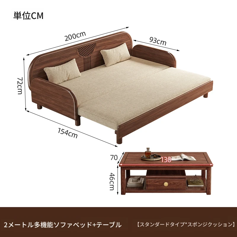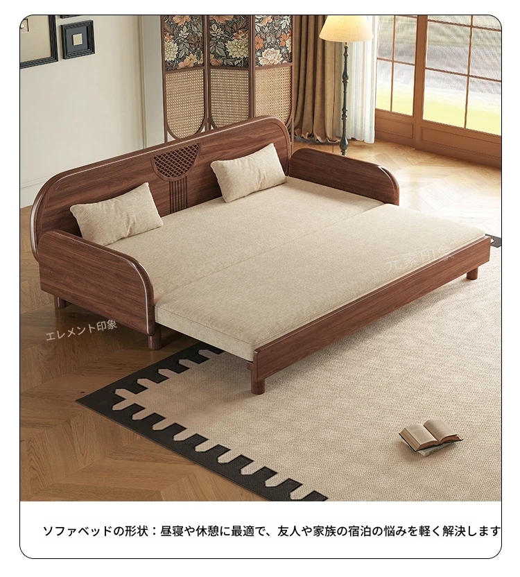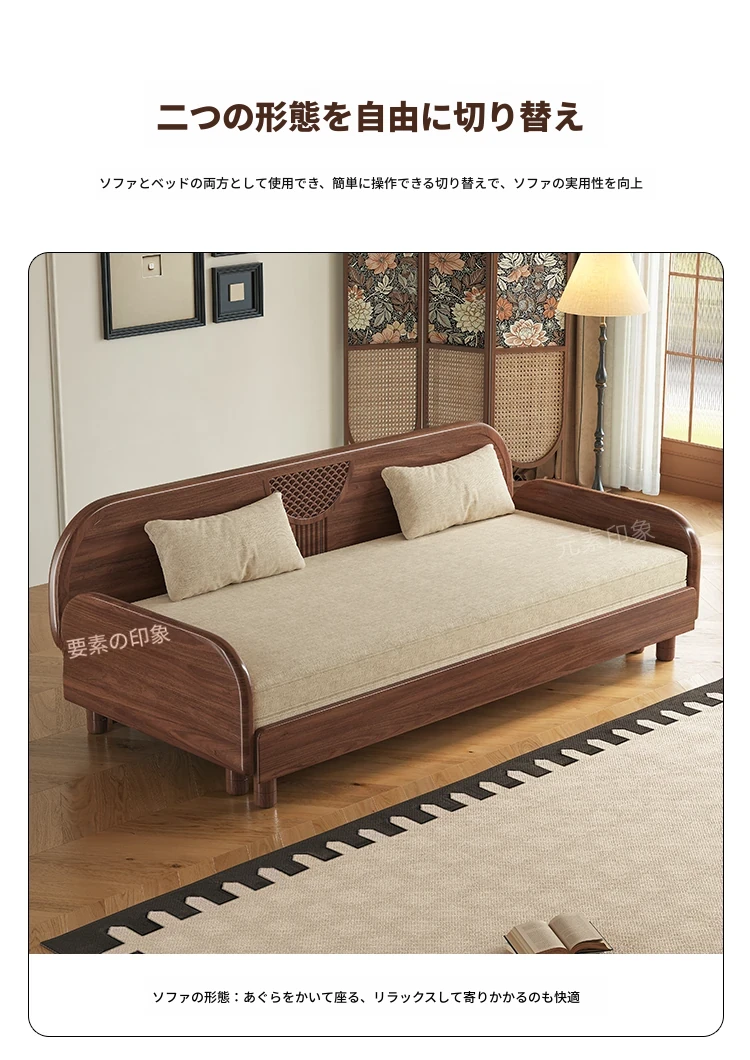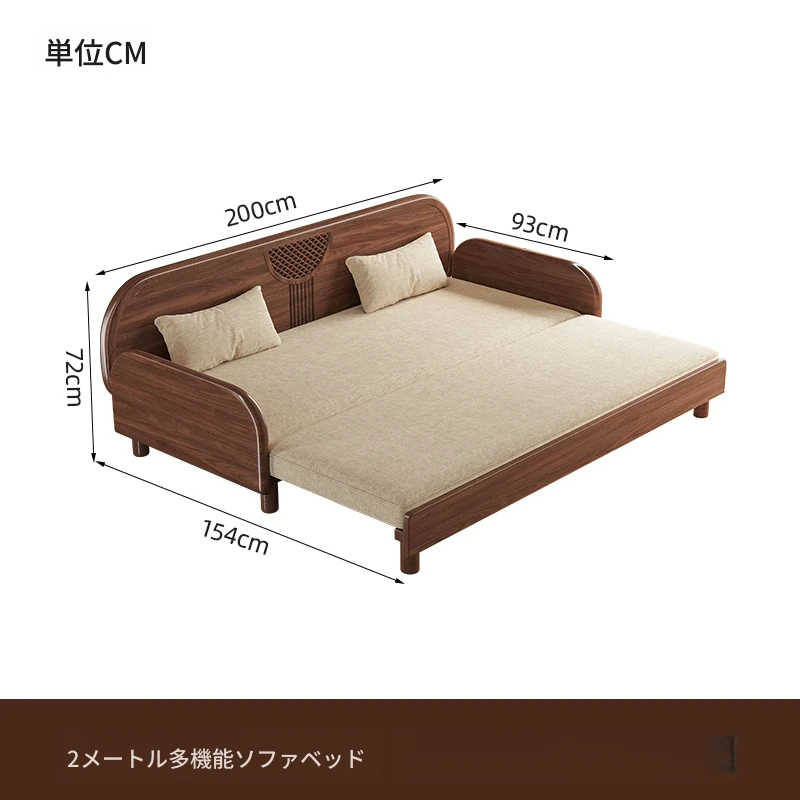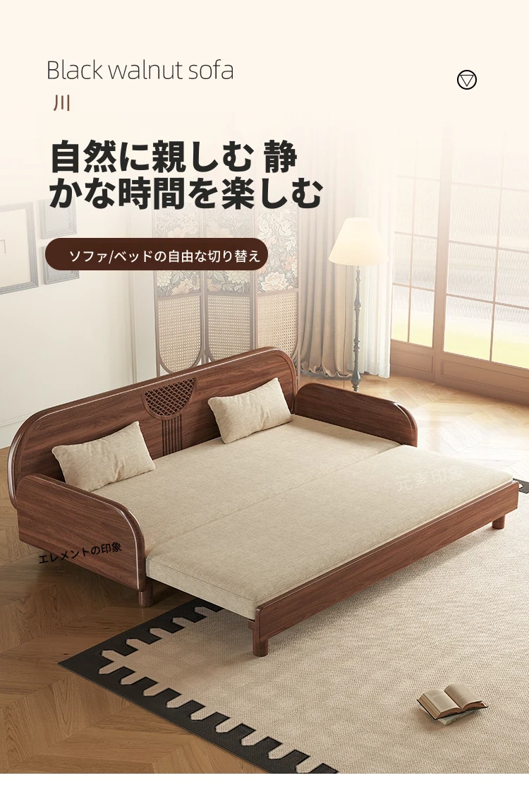 新中式デザインのブラックウォールナット無垢材ソファベッド - スペースを有効活用できる小型リビング向けの伸縮式多機能ソファとベッドの2wayタイプ!快適な座り心地と寝心地を両立したおしゃれなアイテムです。