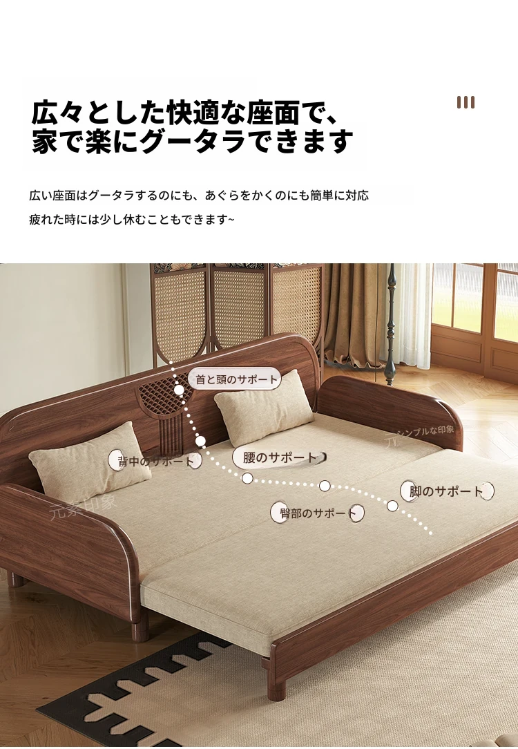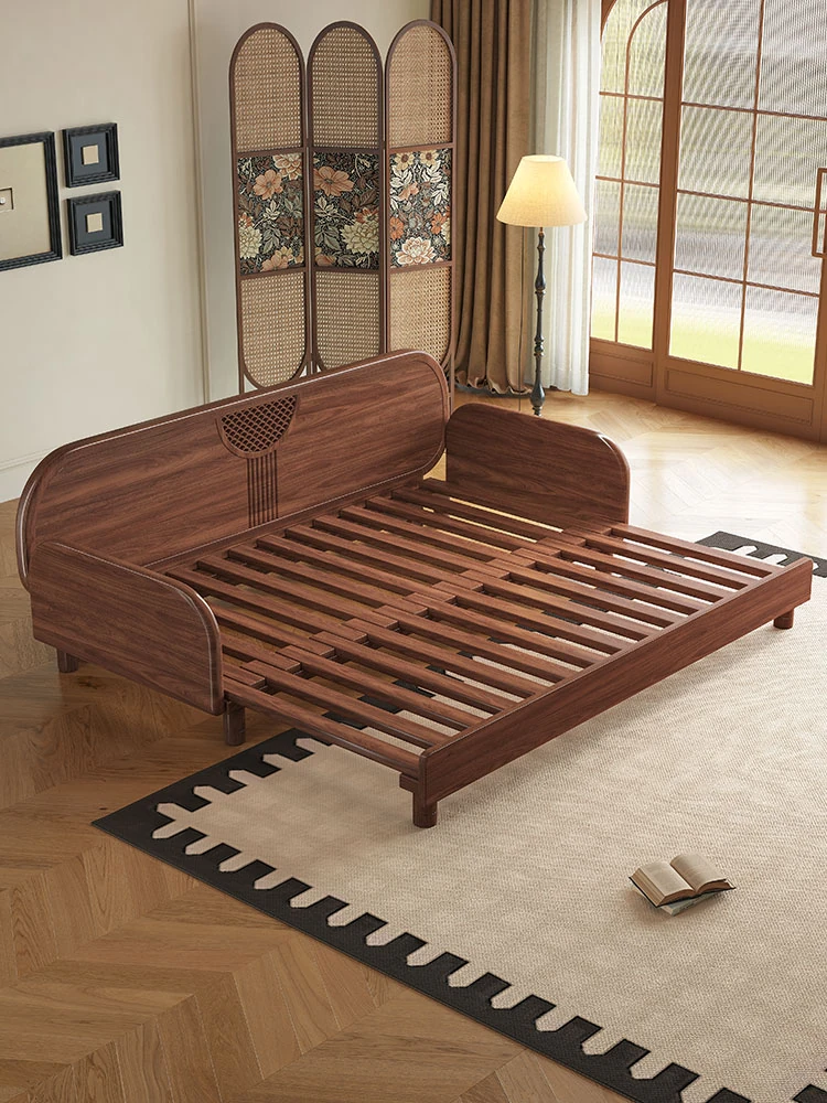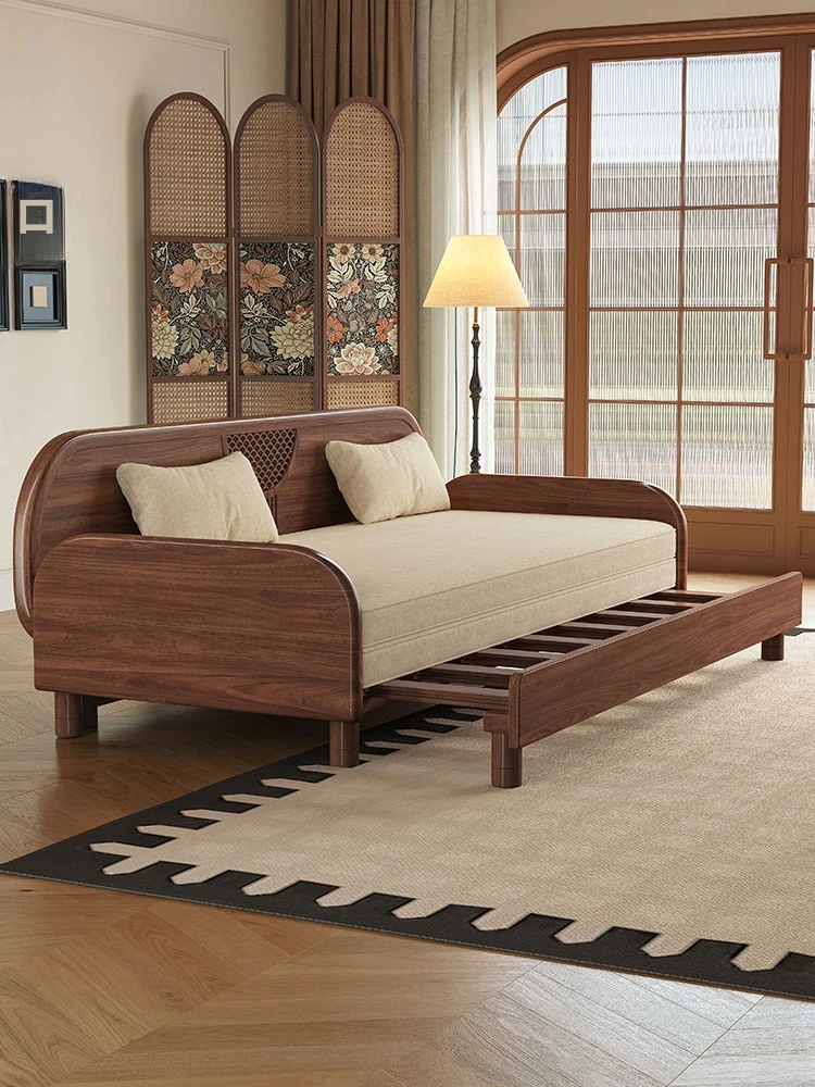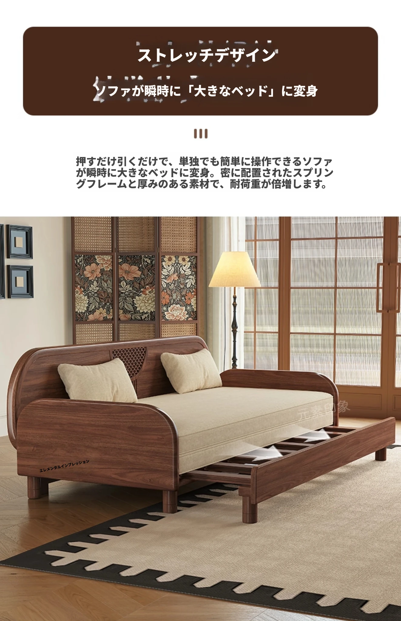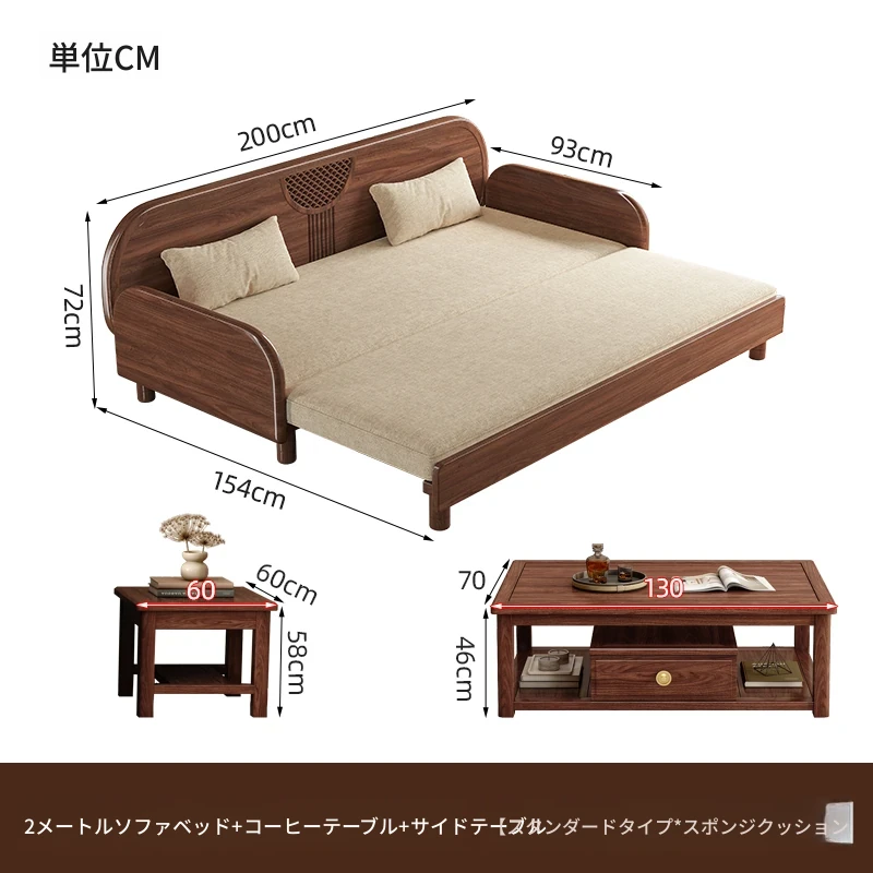 新中式デザインのブラックウォールナット無垢材ソファベッド - スペースを有効活用できる小型リビング向けの伸縮式多機能ソファとベッドの2wayタイプ!快適な座り心地と寝心地を両立したおしゃれなアイテムです。