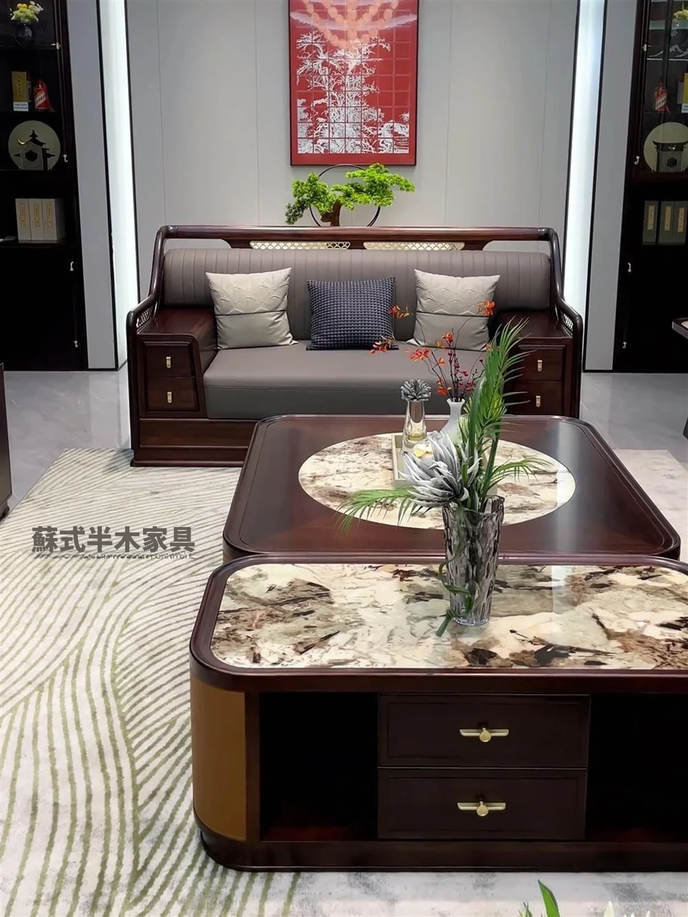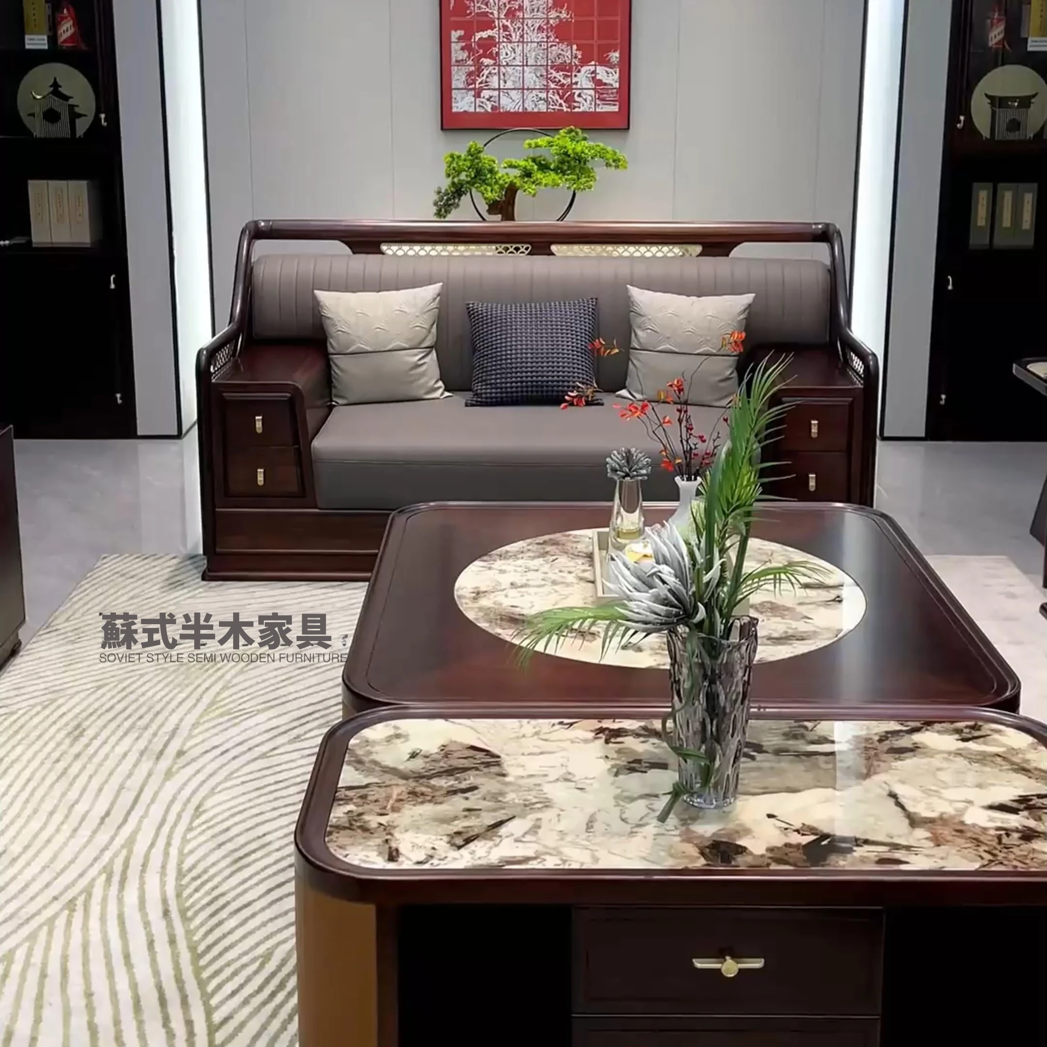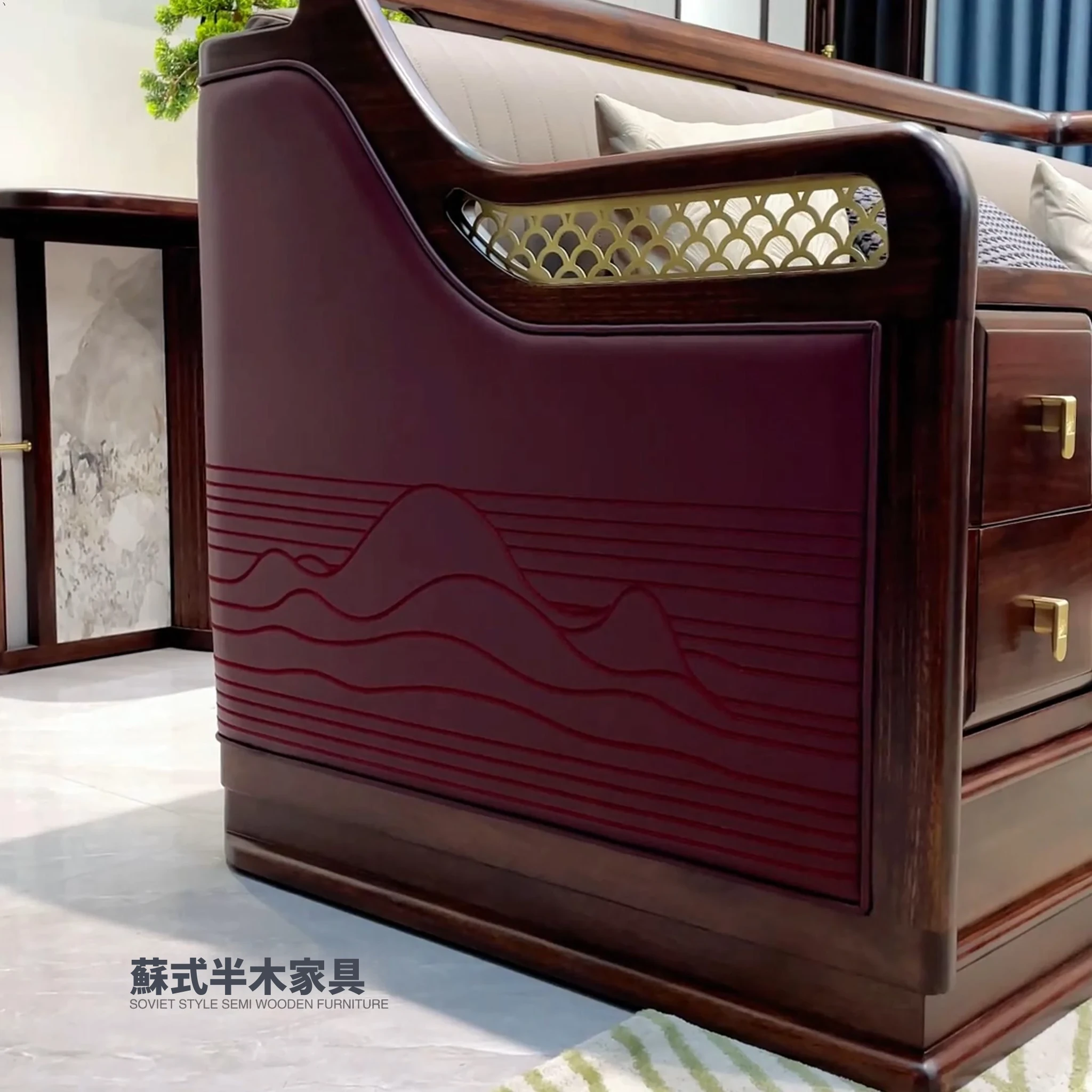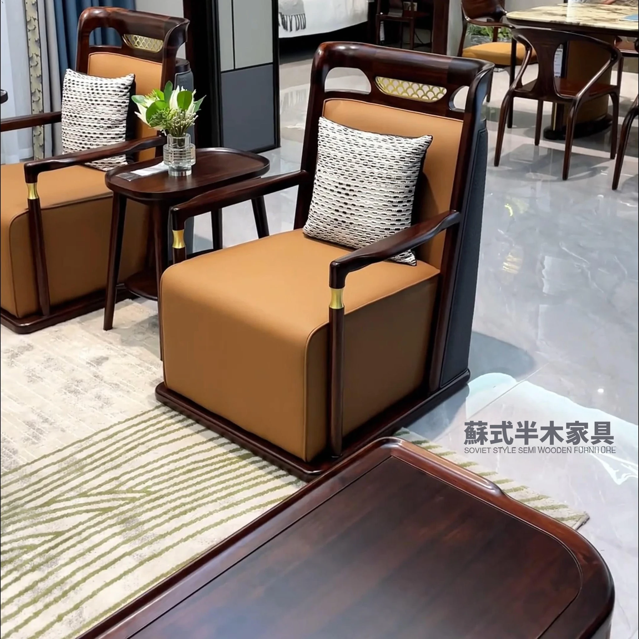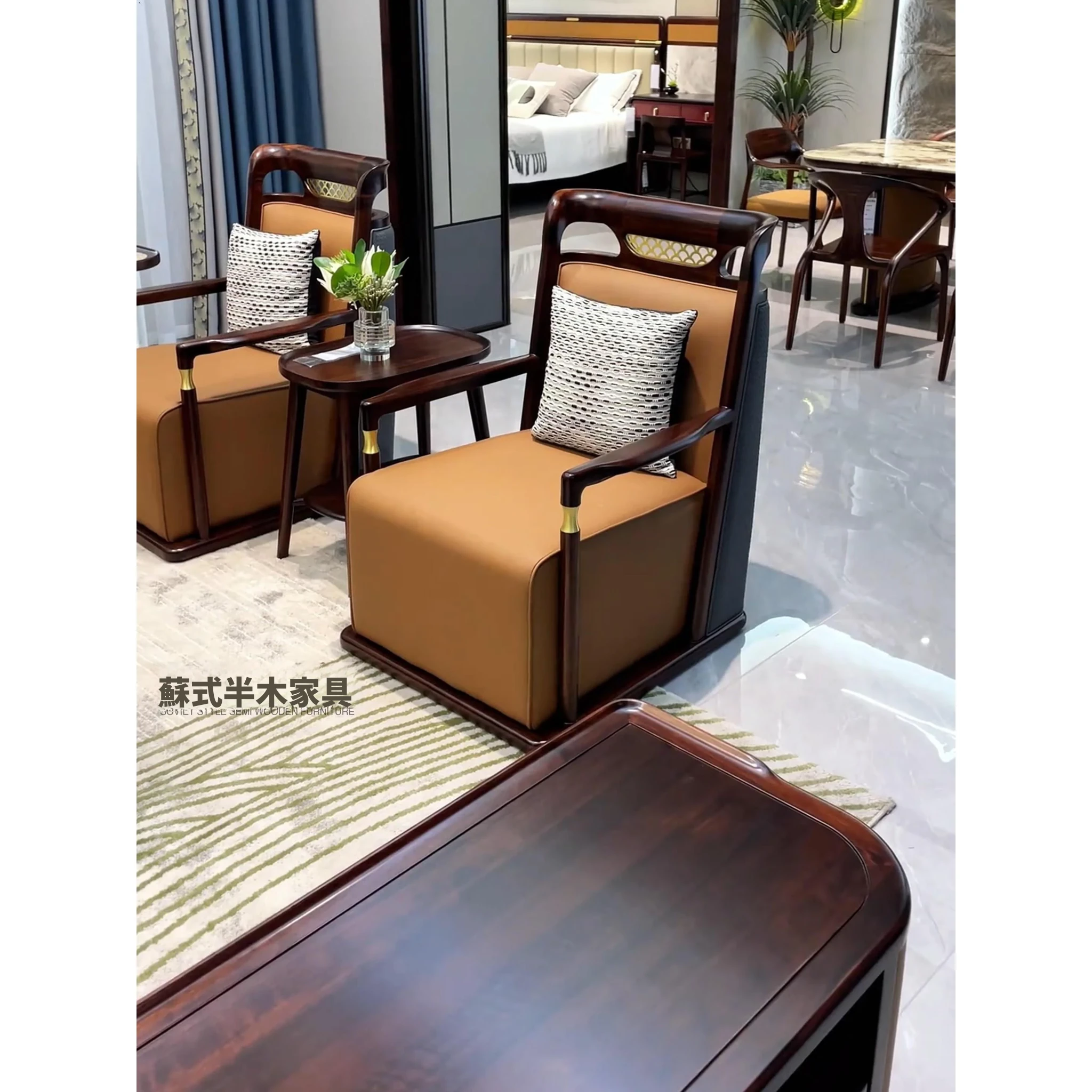 新中式ウッドウエア、真皮軽奢モダンソファー。別荘や大小の住宅にぴったり!肘掛け付き収納ボックスで、実用性と禅の美を兼ね備えた高級家具。あなたの空間を特別に演出します!