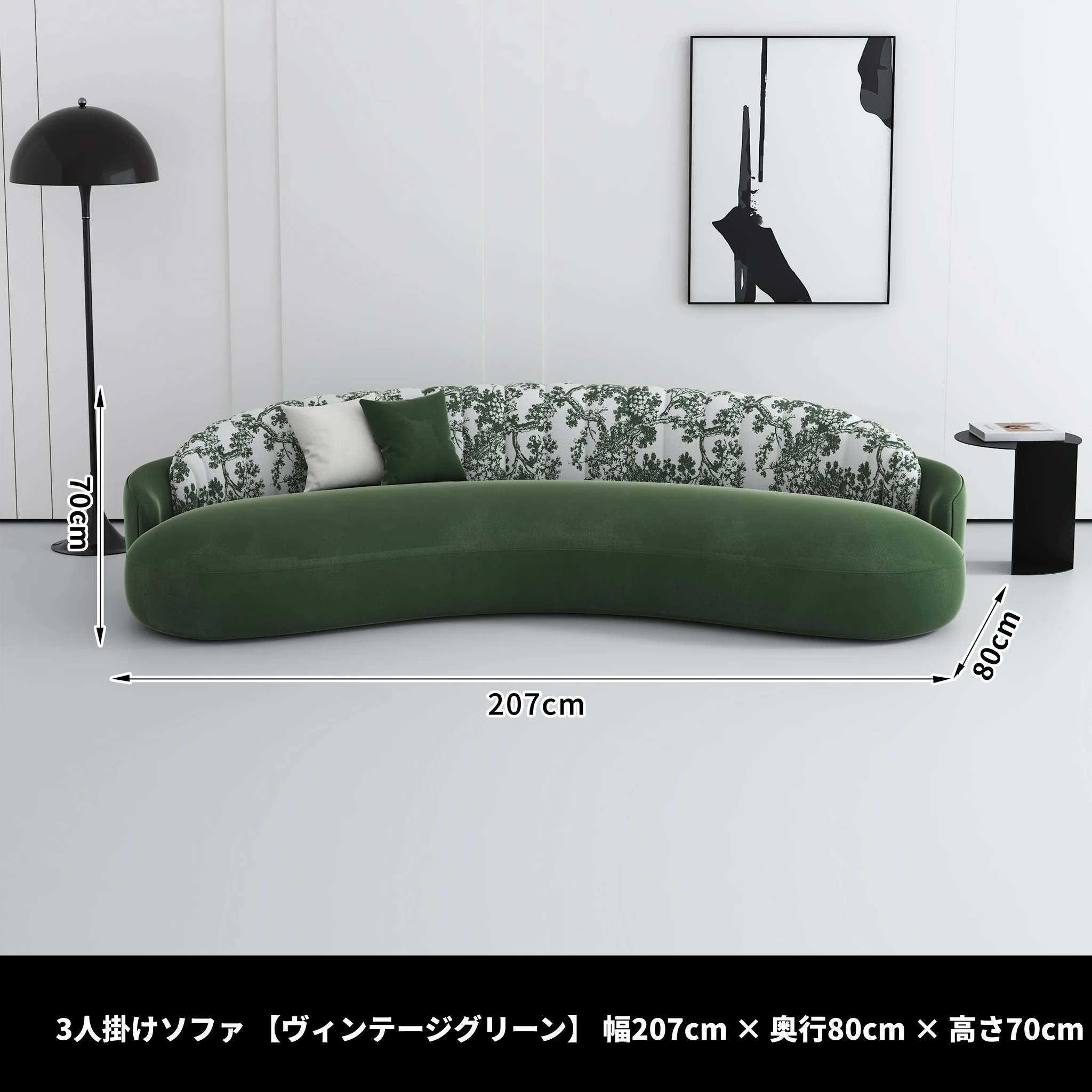 三人掛け207cm【グリーンベルベット+グリーンウメの花模様】