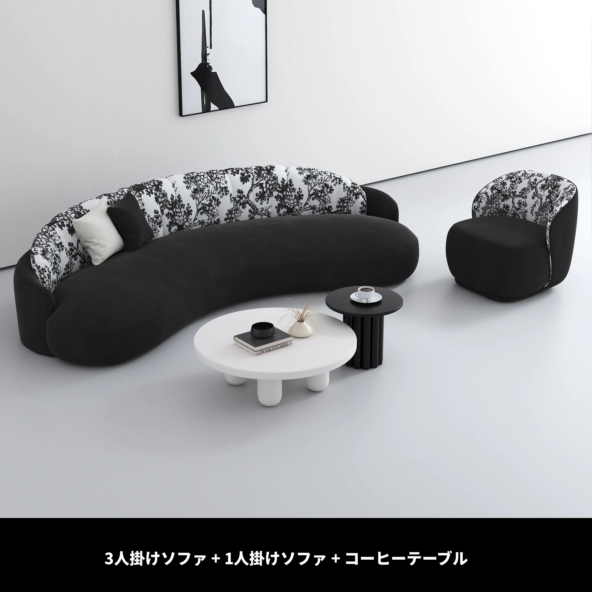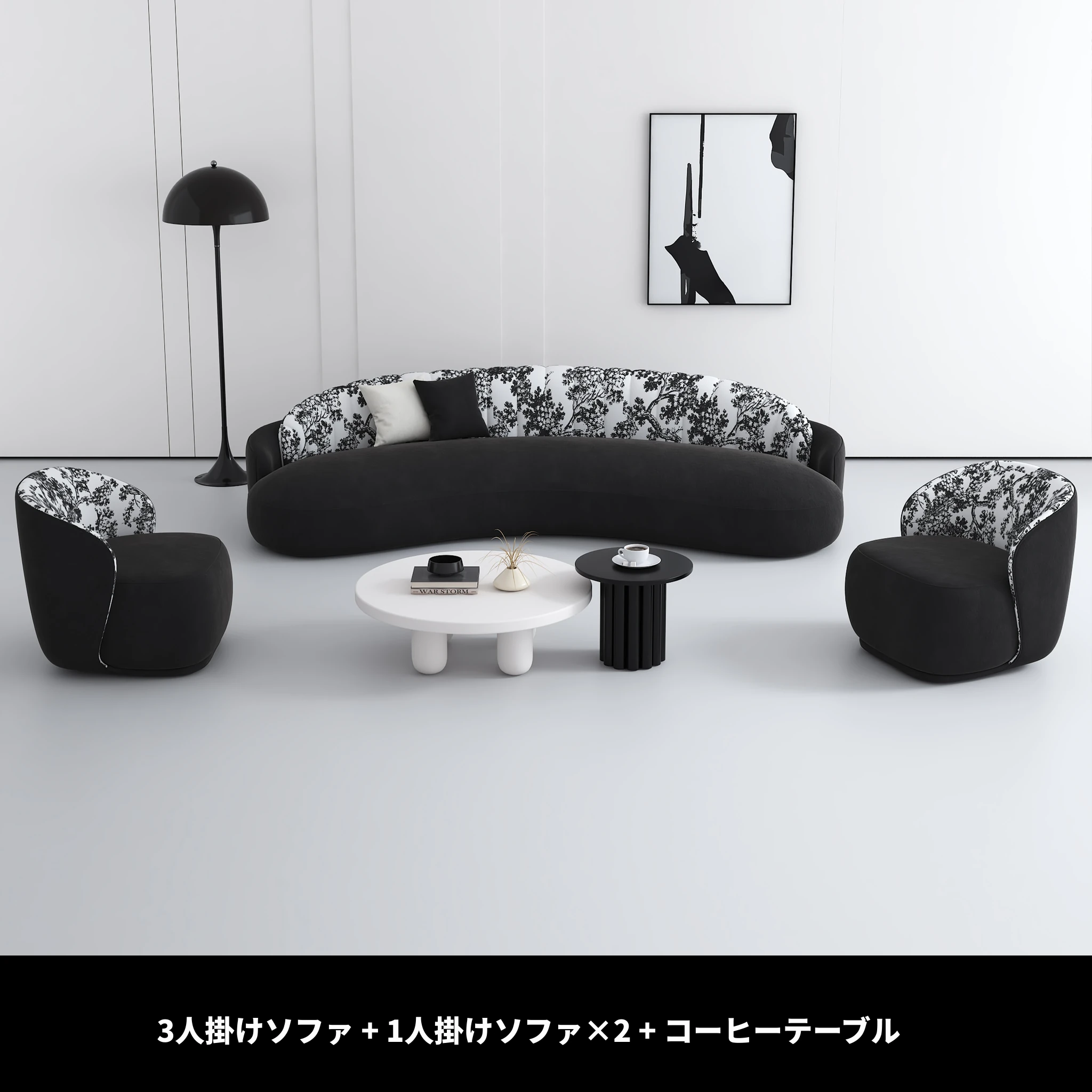 三人掛け207cm【ブラックベルベット+水墨の森の花模様】