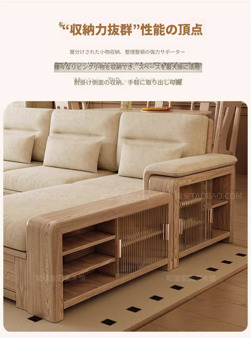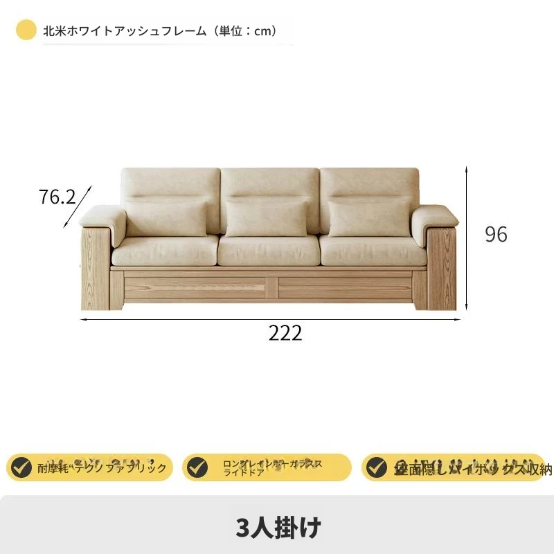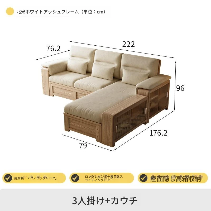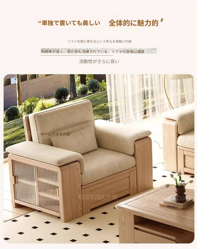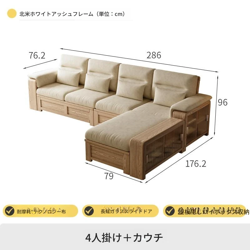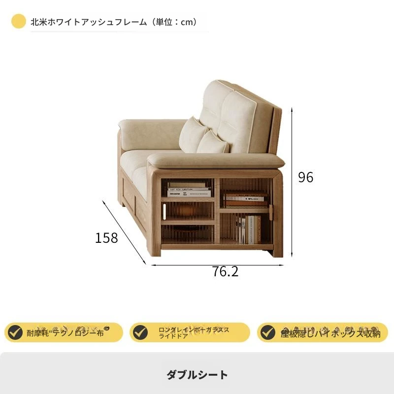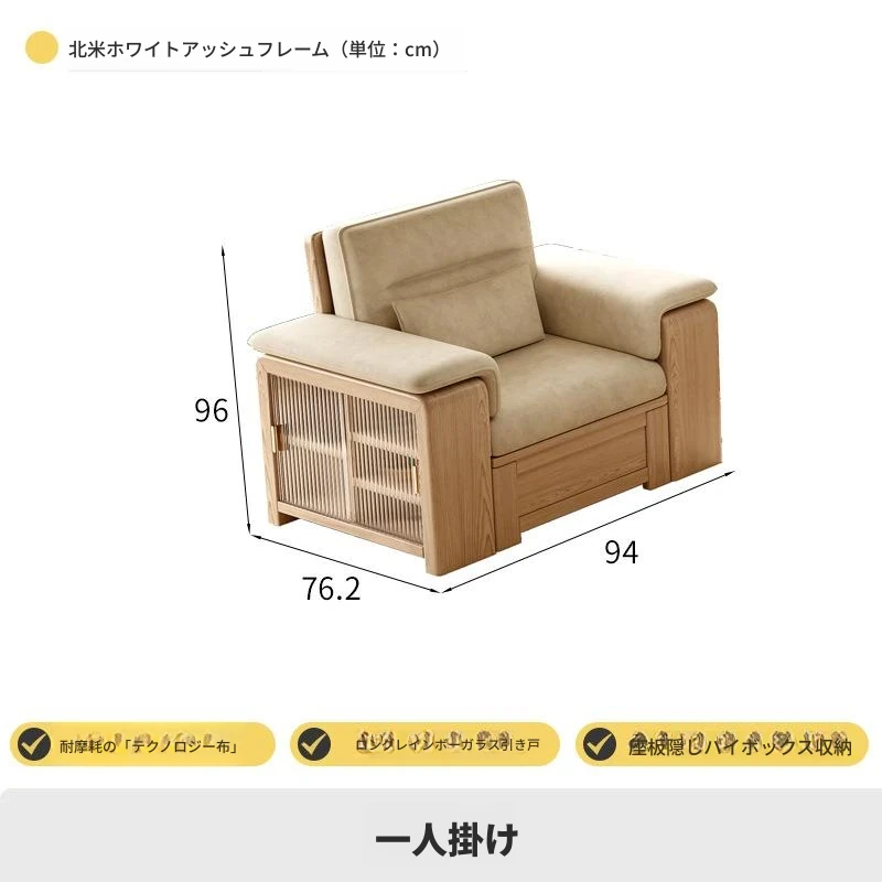 ホワイトアッシュ無垢材ソファ 小型リビング向け 北欧モダンシンプル デザイン収納付き ガラス&ファブリック仕様 天然木の温もりを感じる素敵なインテリアアイテム!