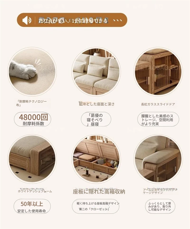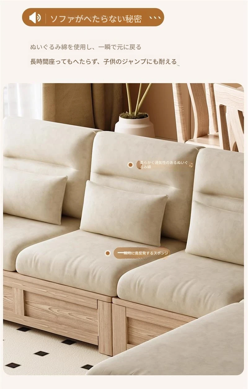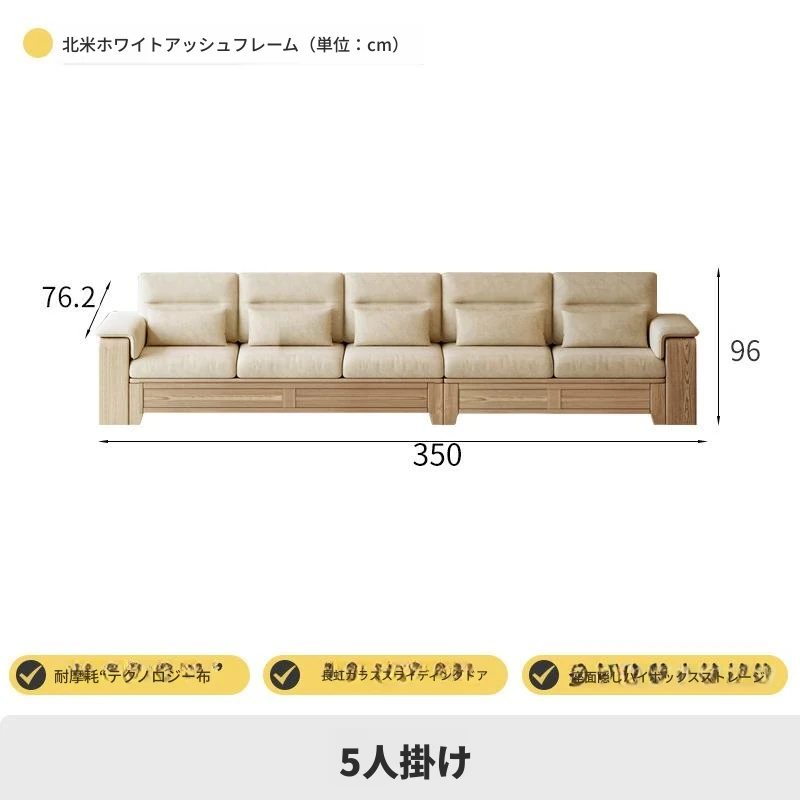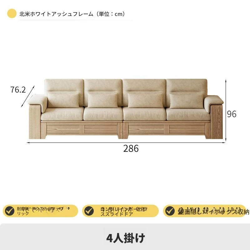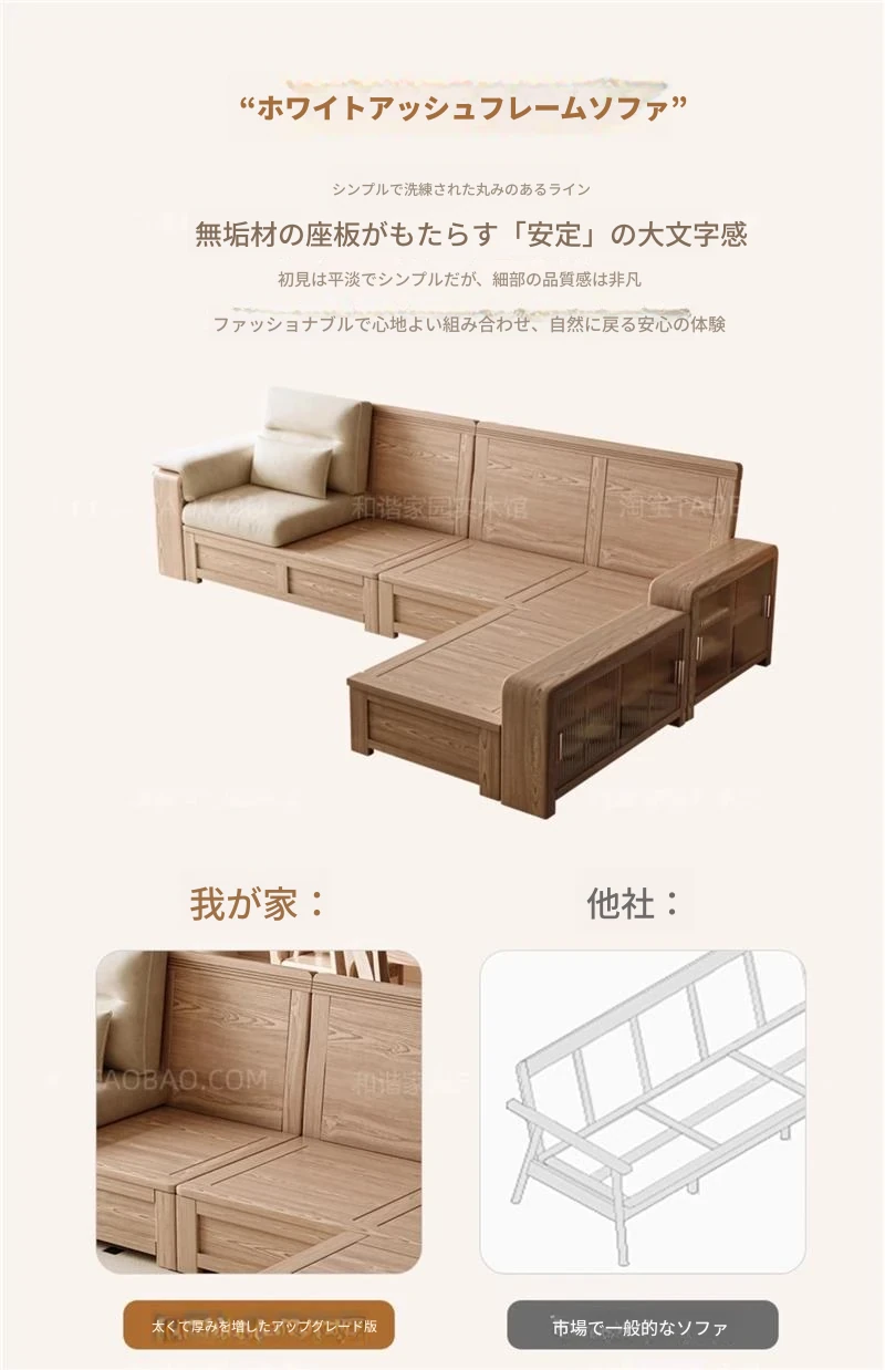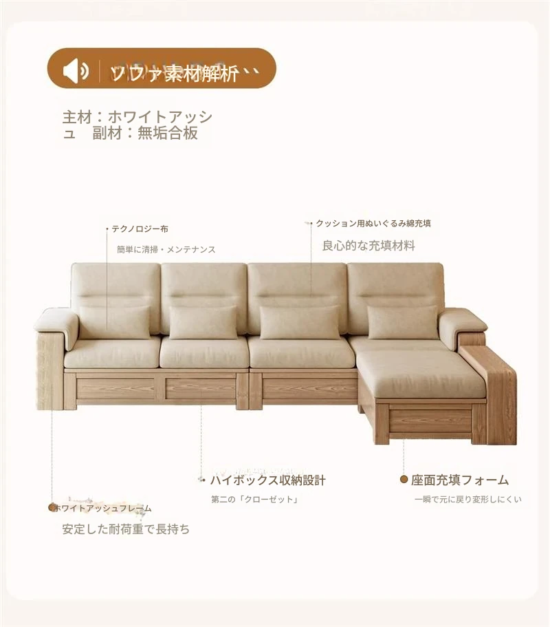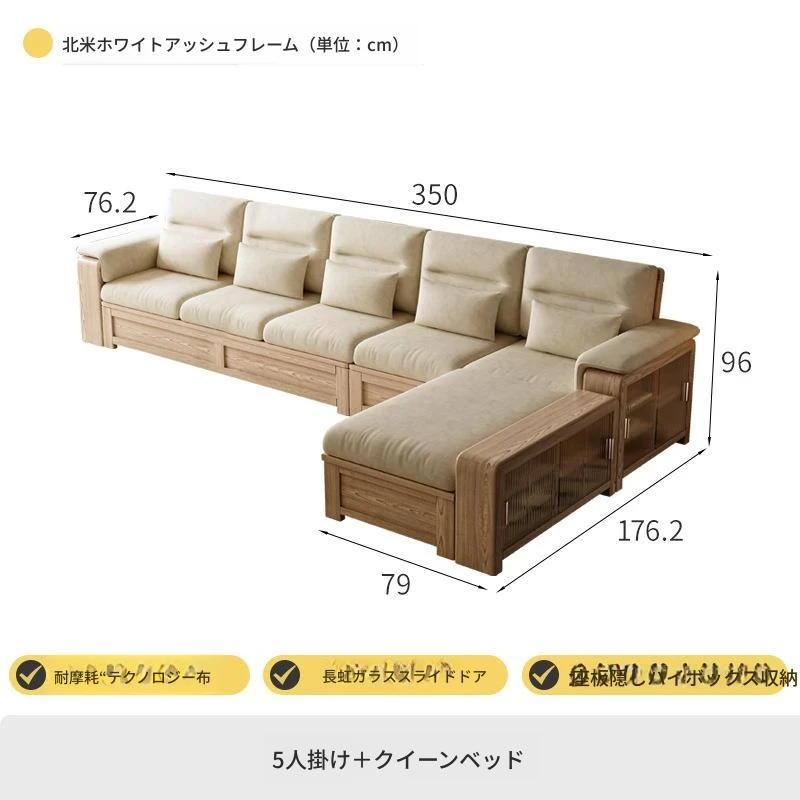 ホワイトアッシュ無垢材ソファ 小型リビング向け 北欧モダンシンプル デザイン収納付き ガラス&ファブリック仕様 天然木の温もりを感じる素敵なインテリアアイテム!