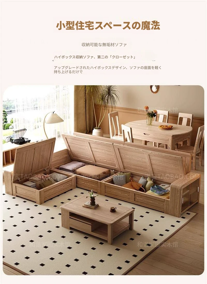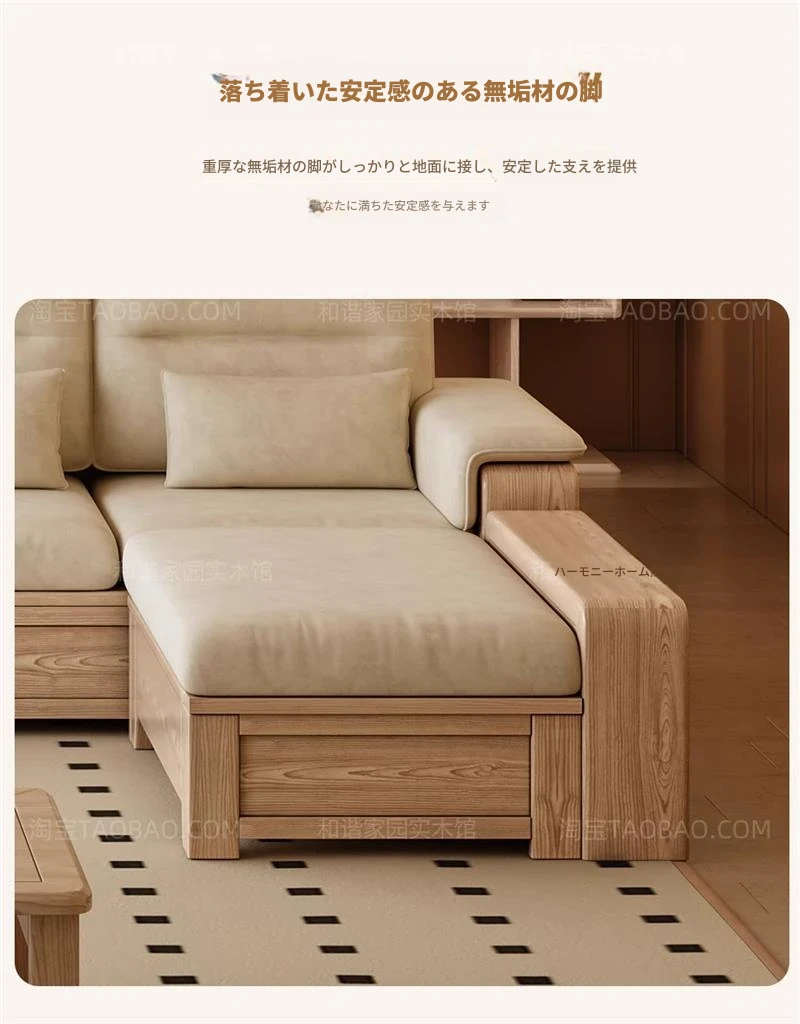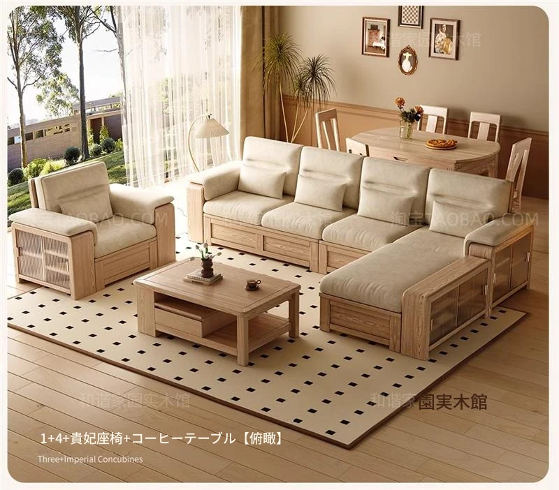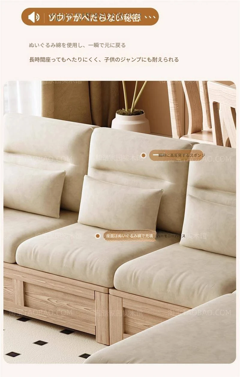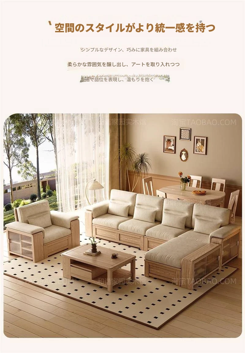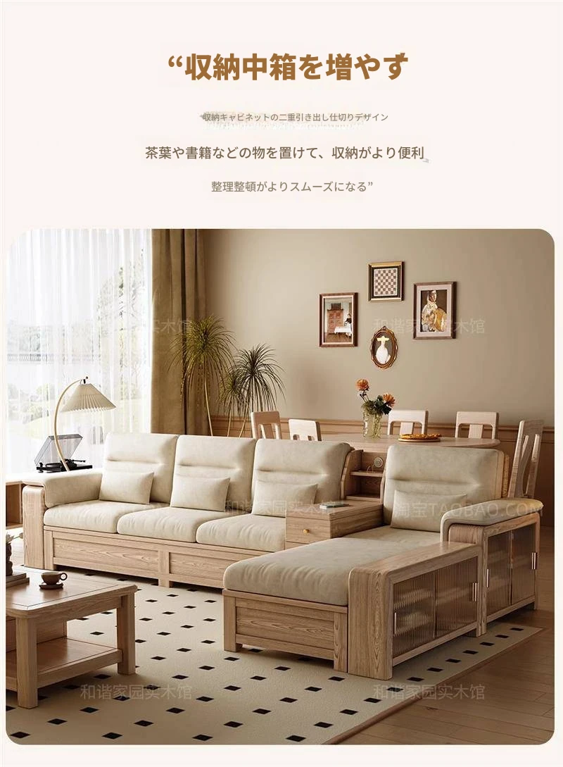 ホワイトアッシュ無垢材ソファ 小型リビング向け 北欧モダンシンプル デザイン収納付き ガラス&ファブリック仕様 天然木の温もりを感じる素敵なインテリアアイテム!