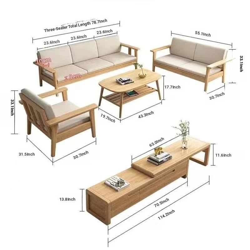 Nordic Solid Wood Sofa - Minimalist Modern Living Room Set with Chaise Lounge, Dual-Use Fabric for Winter and Summer, Perfect for Small Spaces, Natural Wood Finish Furniture