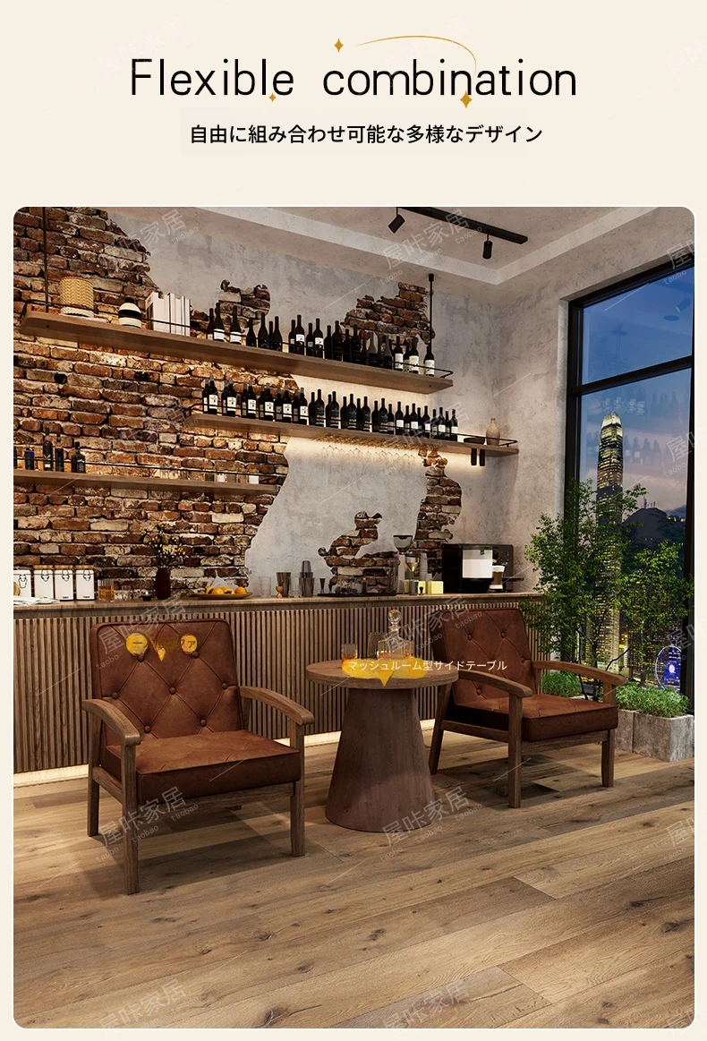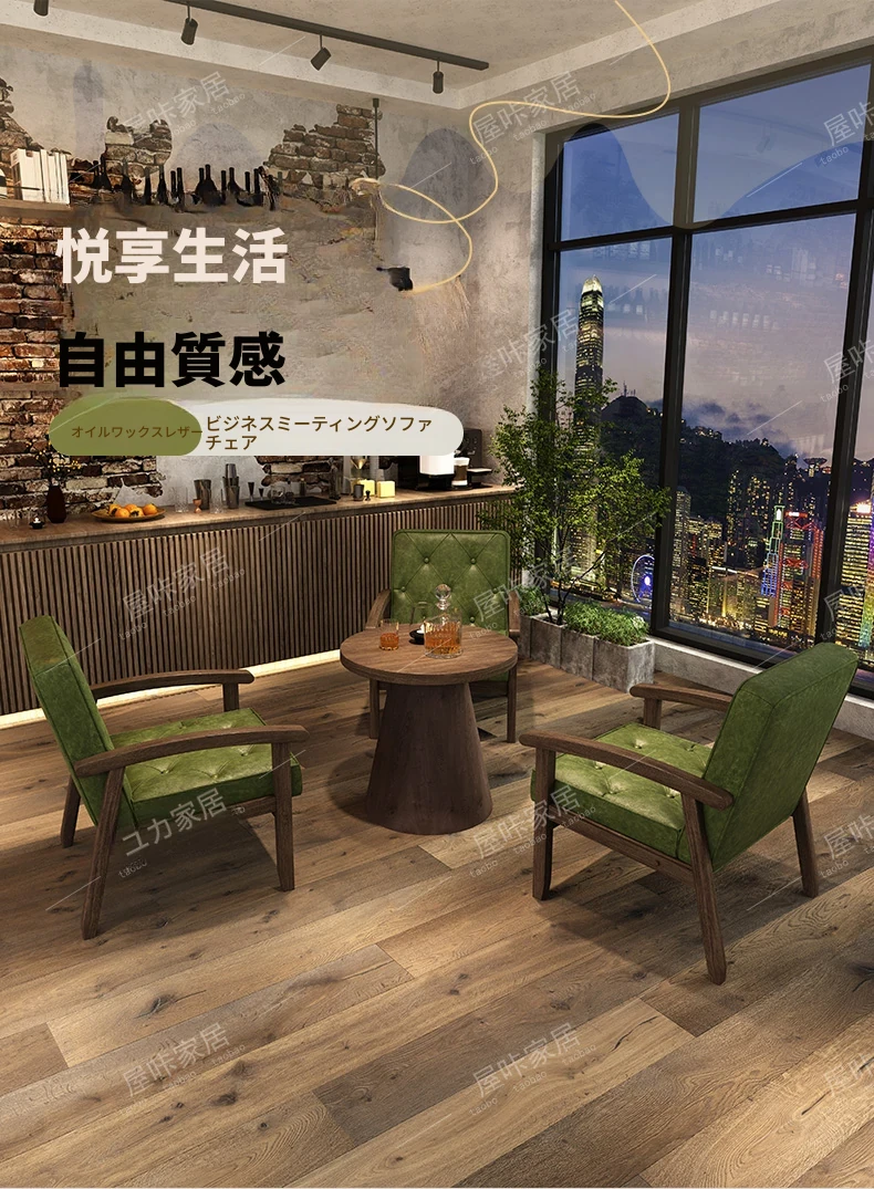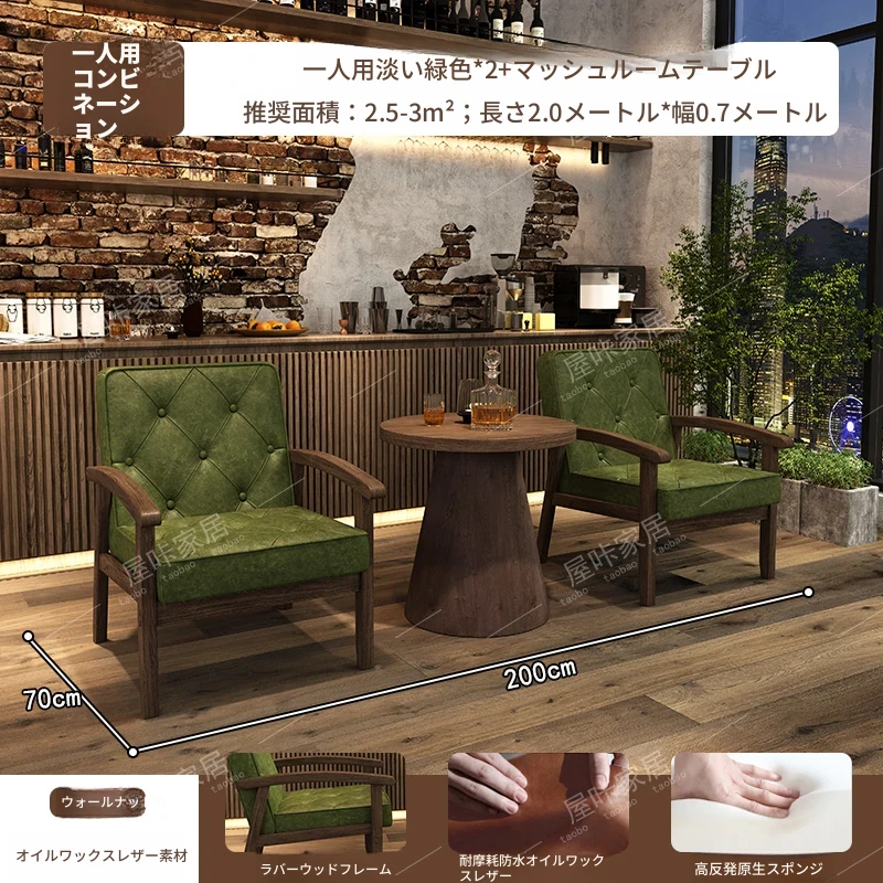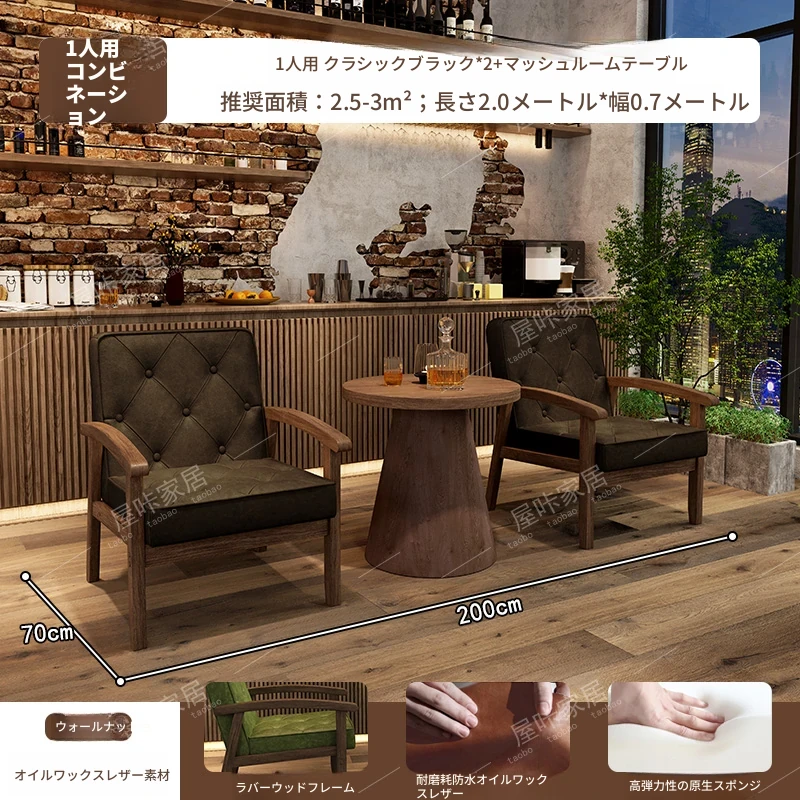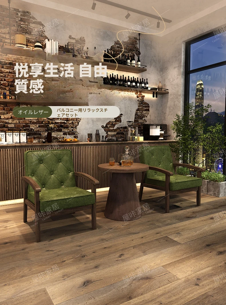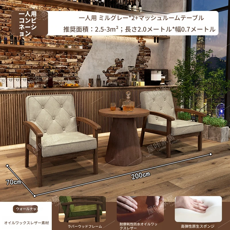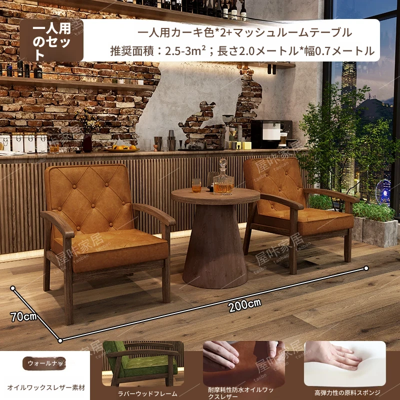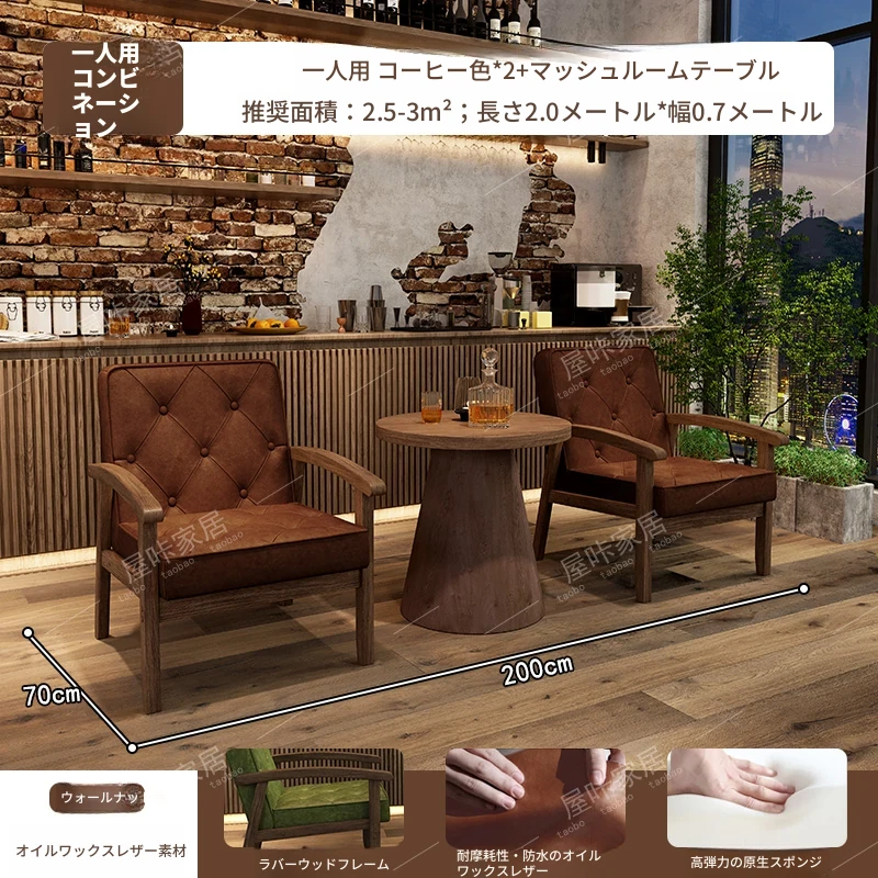 レトロなオイルワックスレザーを使用したリラックスエリア用のソファテーブルセット。バルコニーやホテル、民宿、カフェに最適なスタイリッシュな休憩スペースを演出します。