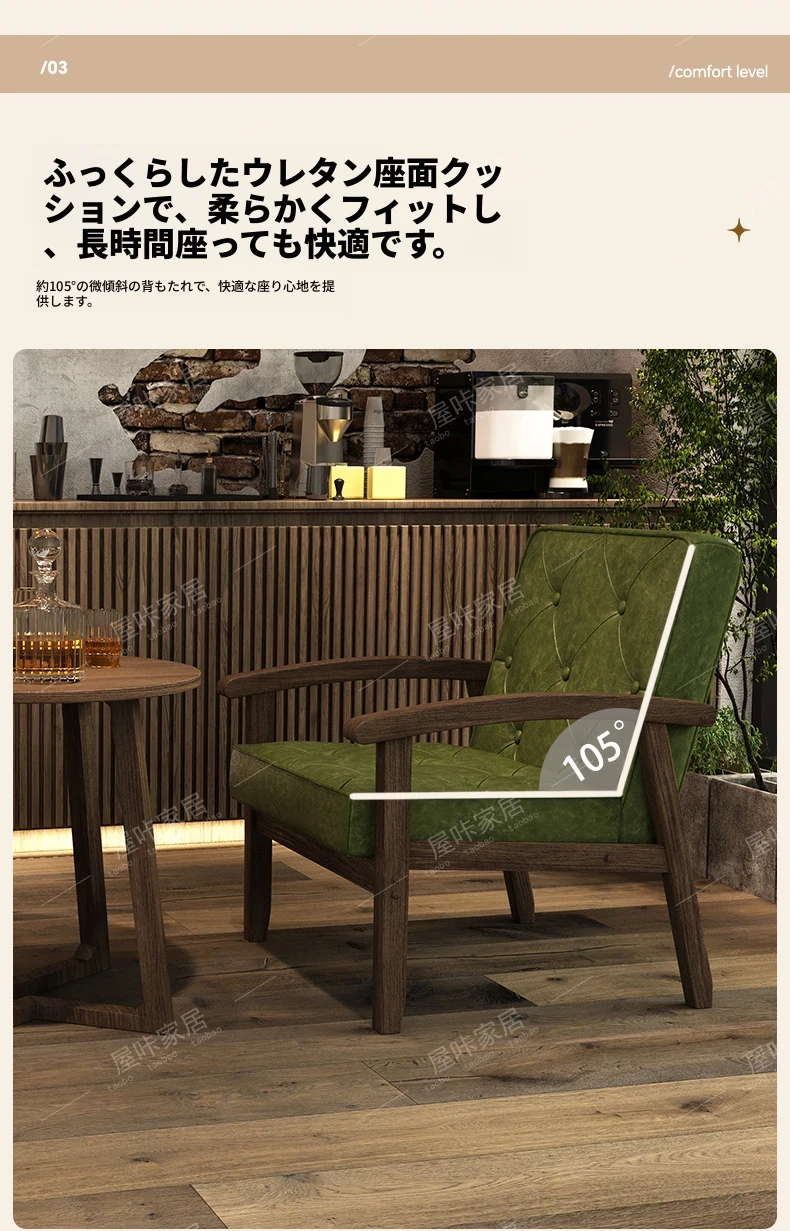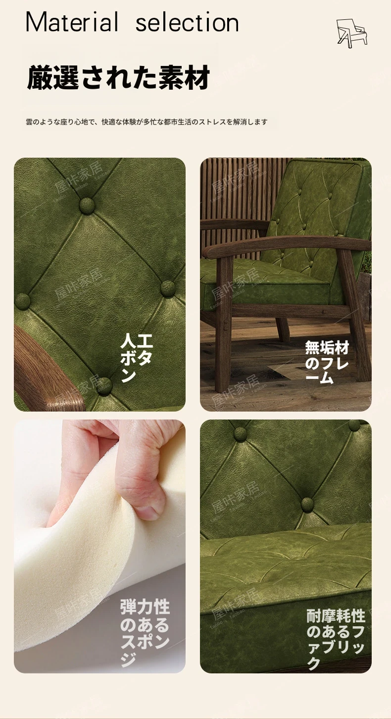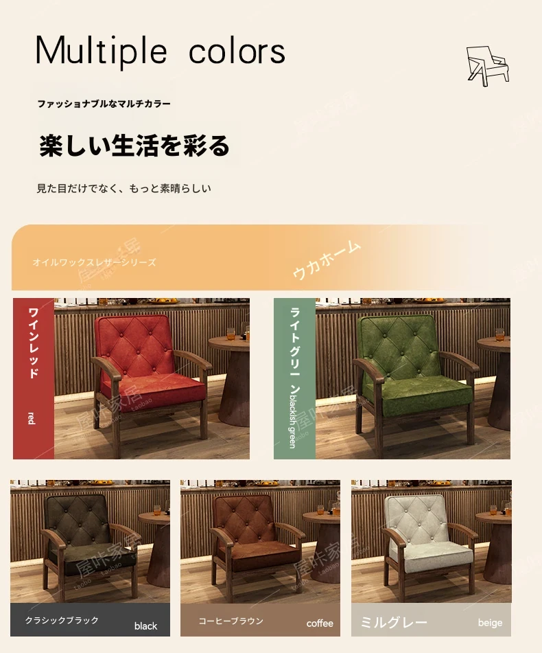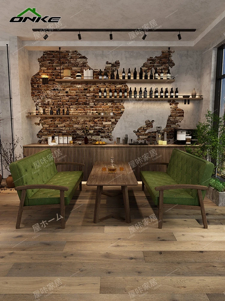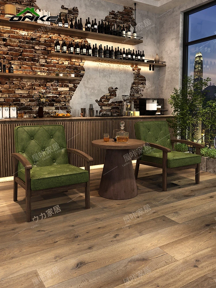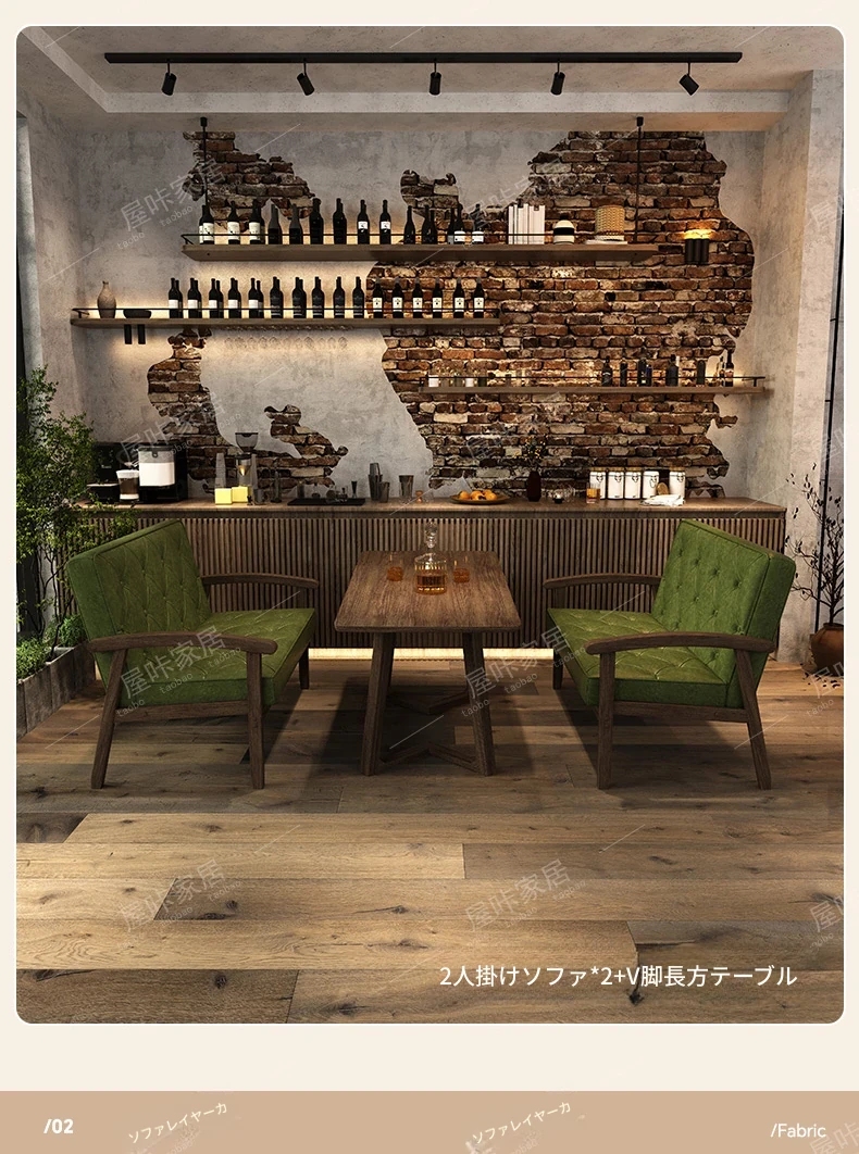 レトロなオイルワックスレザーを使用したリラックスエリア用のソファテーブルセット。バルコニーやホテル、民宿、カフェに最適なスタイリッシュな休憩スペースを演出します。